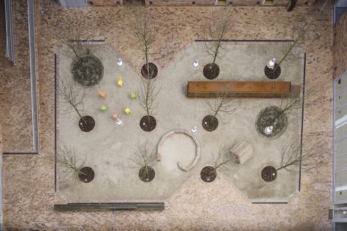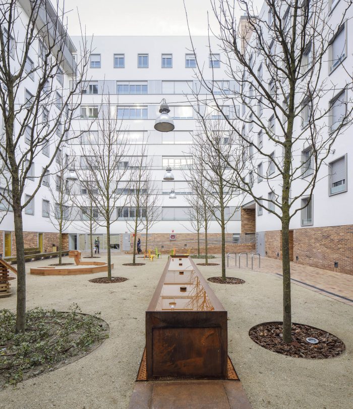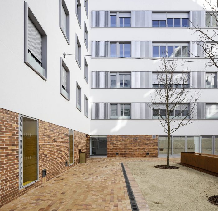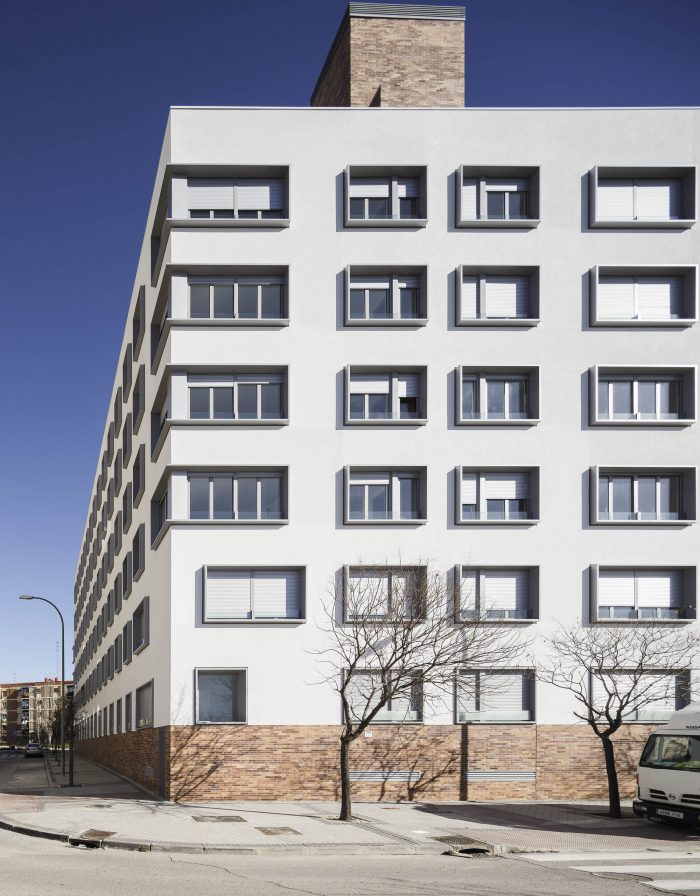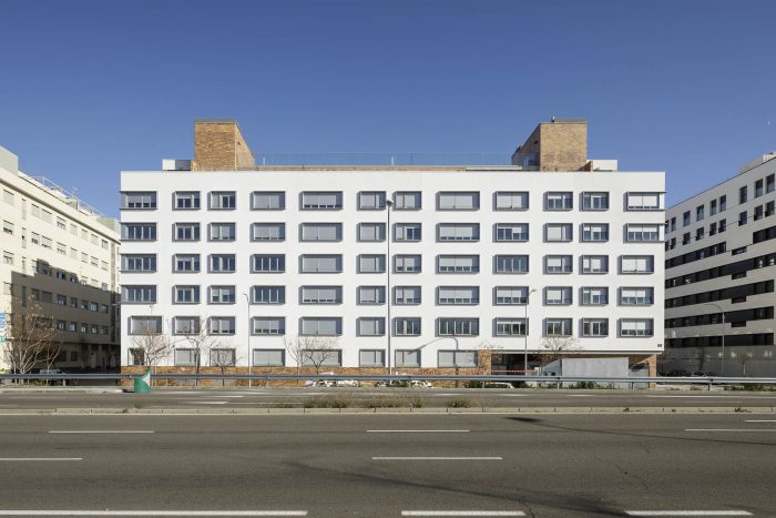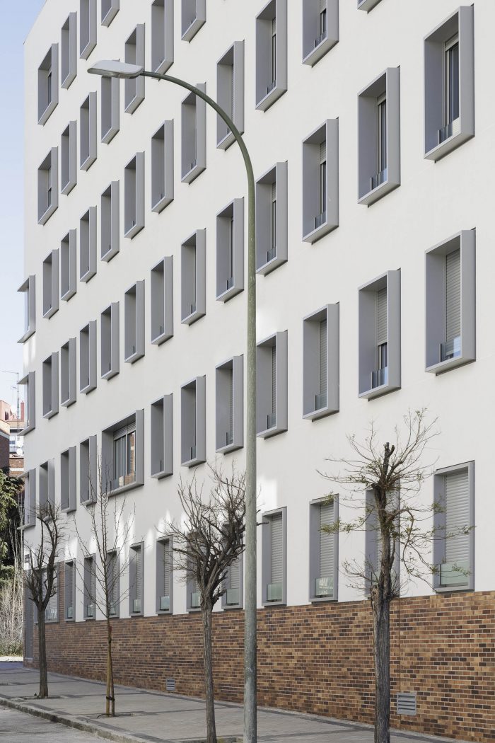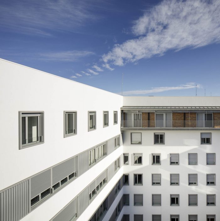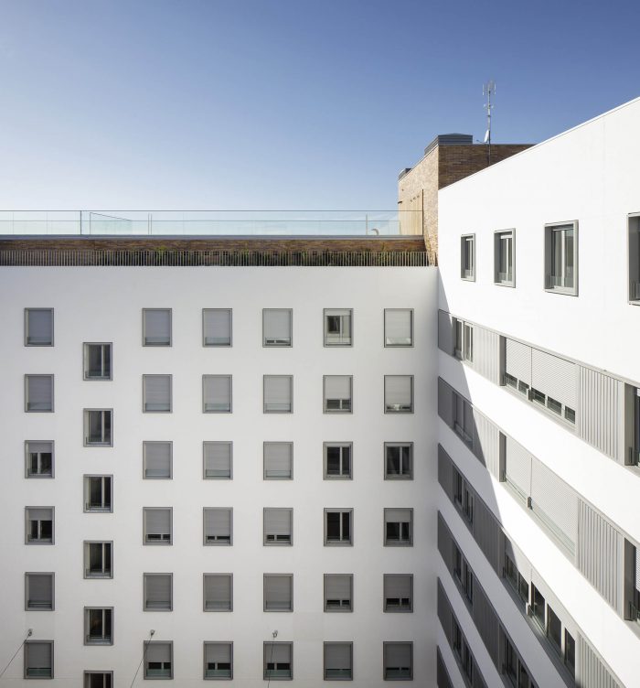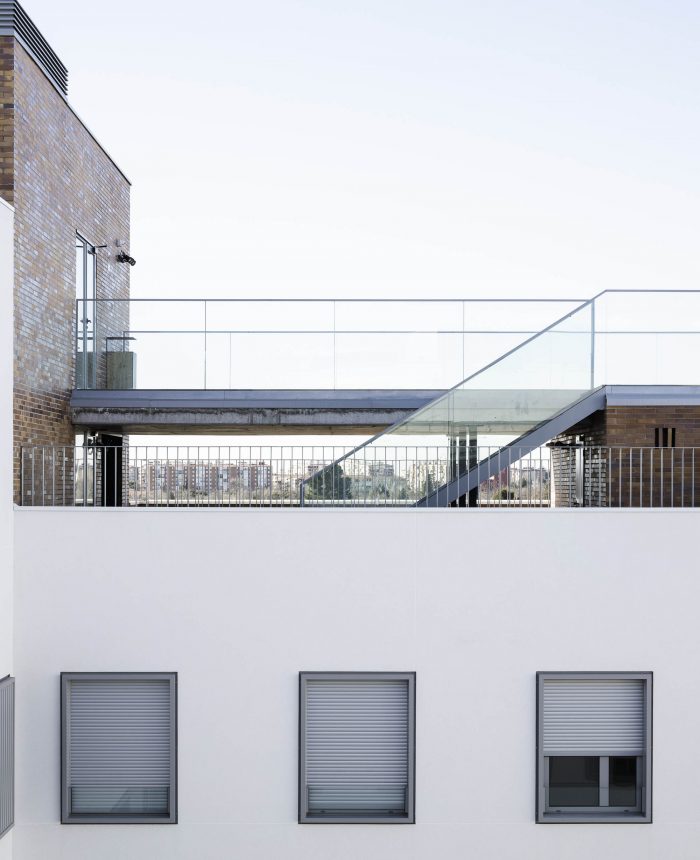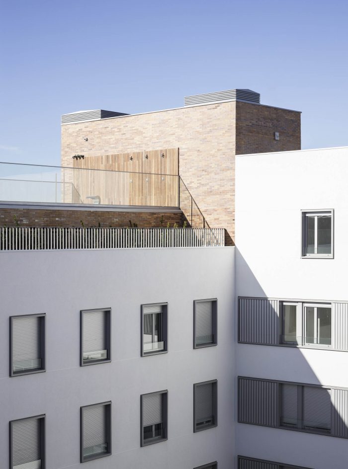 But besides these values, which are directly translated into the rationality of the construction and the economy of the work, the project enjoys other elements that multiply the value of the building. Unlike what is usual in small blocks like this one, the courtyard is a tree-lined place, visually attractive, sufficiently sunny in winter and humid and ventilated in summer. And on the roof, a platform for collective use offers privileged views over the surrounding landscape. Its facades, ordered and expressive, compose a powerful and attractive image. The building's strategy, focused on rationality and efficiency, has been accredited by BREEAM, the sustainable construction certificate.