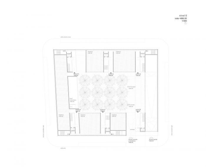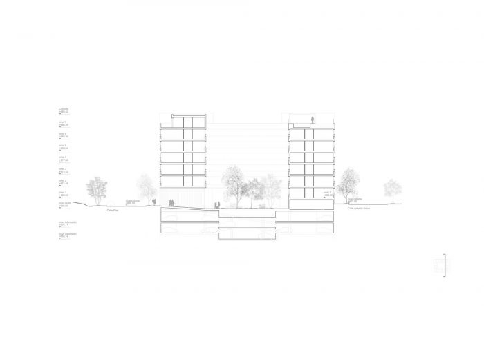 The garage floors, organized in half levels, guarantee a sufficient section of land for landscaping and planting trees on the ground floor. The access floor to the portals is depressed with respect to the street level, so that the ground floor homes behave in reality like first floor homes with respect to the patio.