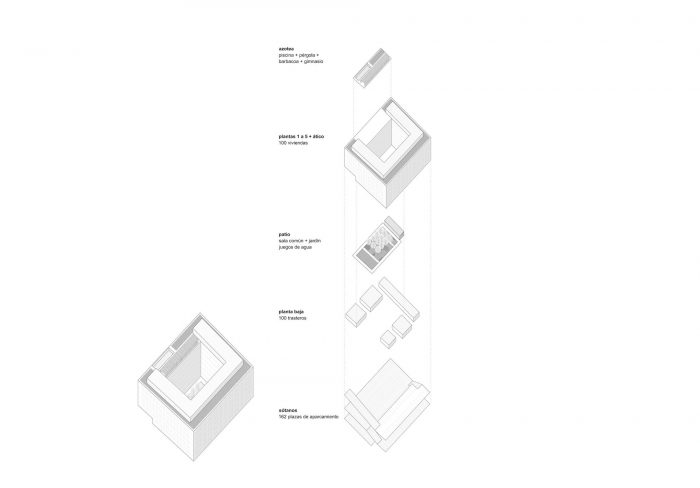 Building Axonometry. The compact volume of the building incorporates, from bottom to top, a series of decisions that clearly improve the performance of a conventional block of this size.