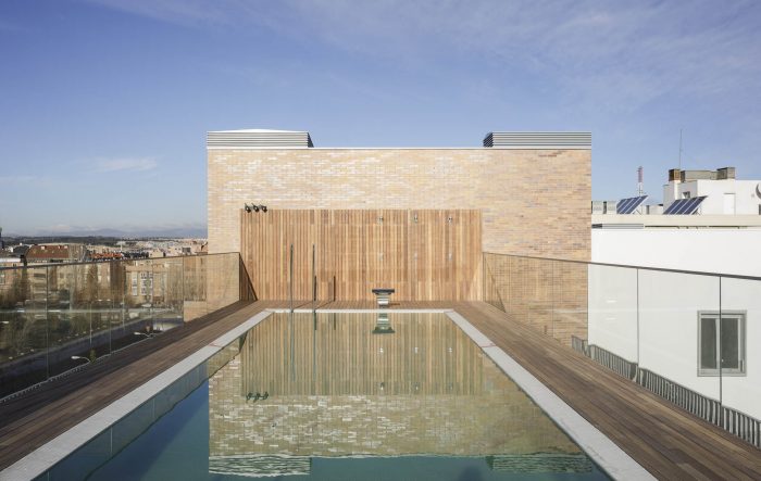 The one hundred homes are organised in a ring and their daytime areas look alternately outwards on their longer sides and, onto the tree-lined courtyard on their shorter sides. In this way, the houses that face the interior are 30 metres apart. The rooftop houses a swimming pool with a solarium and a shaded playground and barbecue area with extraordinary views of the Casa de Campo and the Sierra de Madrid.