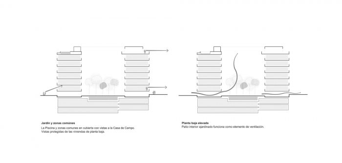 一百户人家呈环状排列,其日间区域较长的一面向外看,较短的一面则向树荫庭院交替看。这样一来,面向室内的房屋相距30米。屋顶上有一个带日光浴室的游泳池,还有一个遮阳的操场和烧烤区,可以看到Casa de Campo和马德里山脉的美景。