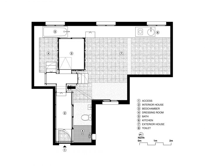 1.利用热梯度进行房屋的功能和方案配置,而不是通过房间和走廊的组合进行最常见的配置。在新的建议中,选择了一个分布,每个空间的气候和环境特性是不同的。就像洋葱的层次一样,房子的不同空间相互嵌套,从最冷的到最热的,以利用每一层的空气和材料,而不需要提供额外的能源。这种类型的分布,在气候上的多样性,使得功能方案、气候和效率得以统一。