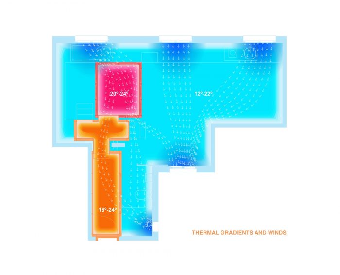 1. Work with thermal gradients for the functional and programmatic configuration of the house instead of the most usual through the combination of rooms and corridors. In the new proposal, a distribution is chosen where the climatic and environmental specificity of each space is different. As if it were the layers of an onion, the different spaces of the house are nested inside each other, from the coldest to the hottest, to take advantage of each layer of air and material without having to provide extra energy. This type of distribution, climatically diverse, allows for the unifying of functional programs, climate, and efficiency.