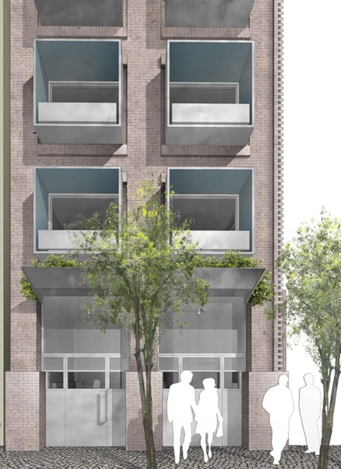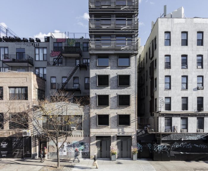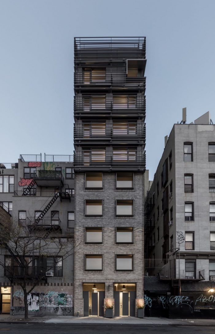 120 Allen Street located on the Lower East Side of Manhattan and is comprised of sixteen furnished studios and four furnished apartments with a commercial space at grade. Grzywinski + Pons designed the building, the interiors, and much of the furniture. Located on an infill lot in a classically gritty LES tenement block, the property — while very narrow — is block-through and as such has frontage on both Allen and Orchard Streets. In order to accommodate the allowable floor area on such a narrow footprint, we bifurcated the mass on the north-south axis creating a slender ten-storey tower on the Allen Street side (a far wider thoroughfare with arresting skyline views) and a five-story volume on narrow Orchard Street which are contiguous in plan. While the west facing tower isn’t strictly non-contextual (there are a few other far bulkier “finger buildings” on the block) we did see the upper portion of our tower as heterogeneous and decided to design the building accordingly. By treating the top five floors conceptually as a vertical augmentation to the neighborhood’s historical typology we elected to create a different skin for it.