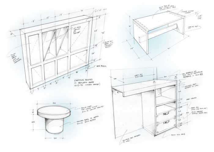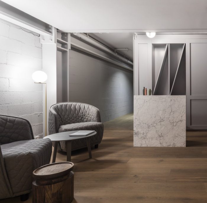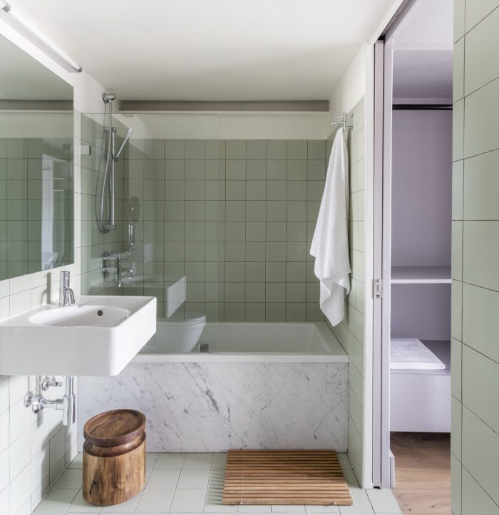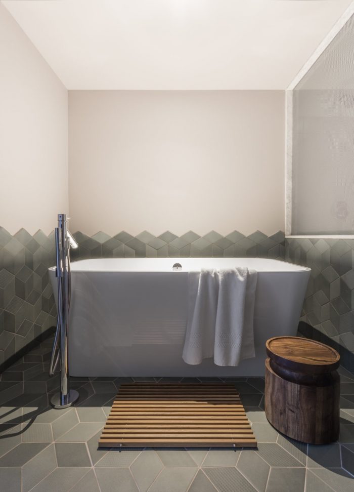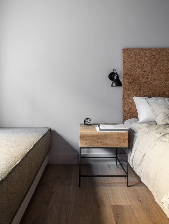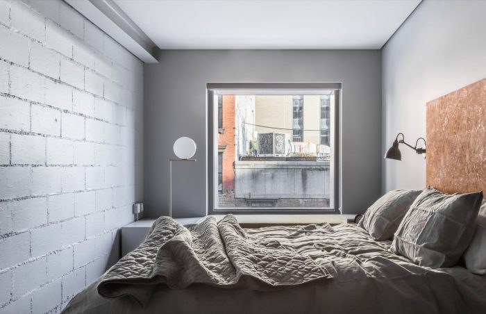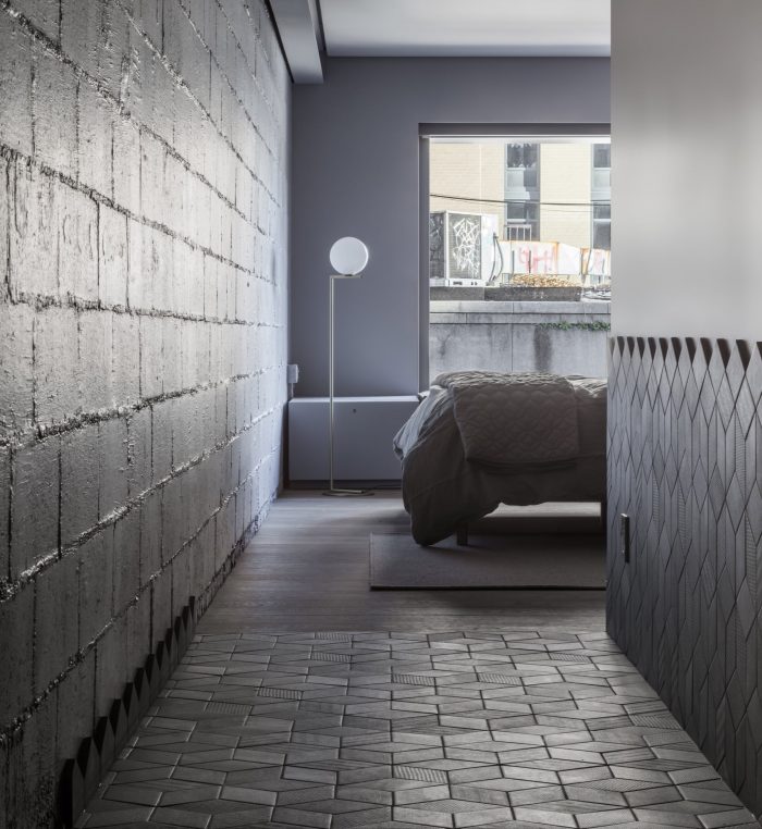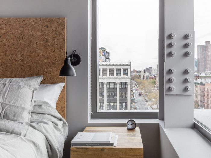 On the interior we decided to celebrate the steel structure by exposing it wherever possible which helpfully yielded more width within the constrained lot. Those girders, columns, bolts and junction plates coupled with block and masonry are balanced with a collection of warm, soft and luxurious finishes, fabrics and furnishings. We were conscious of the depth of the spaces and the special character the light has when it stretches through the interiors; grazing walls, upholstery, bedding and tile. We designed them all in such a way to extol the virtues of that long light. Cozy, comfortable, intimate rooms but with a sense of drama and a real reflection of context. These are rooms in the heart of the Lower East Side and, as pampered as one might be within them, we wouldn’t want you to think you were anywhere else.