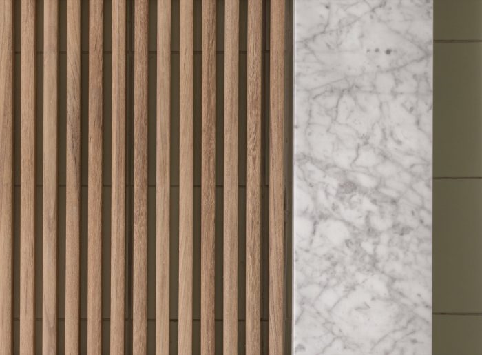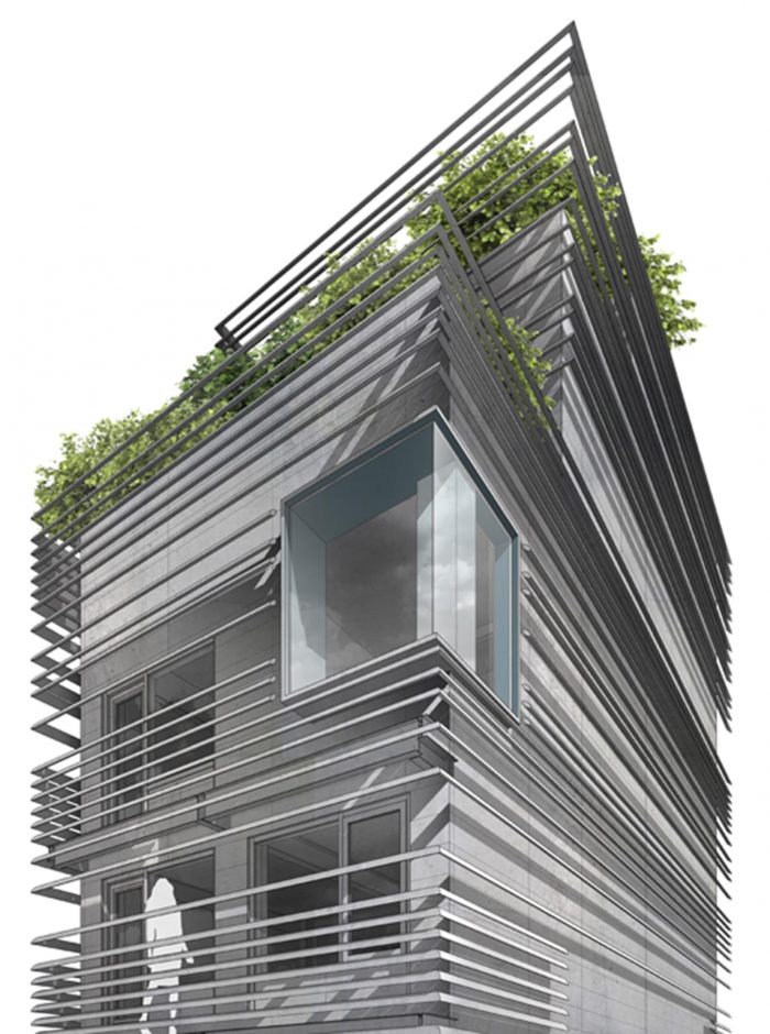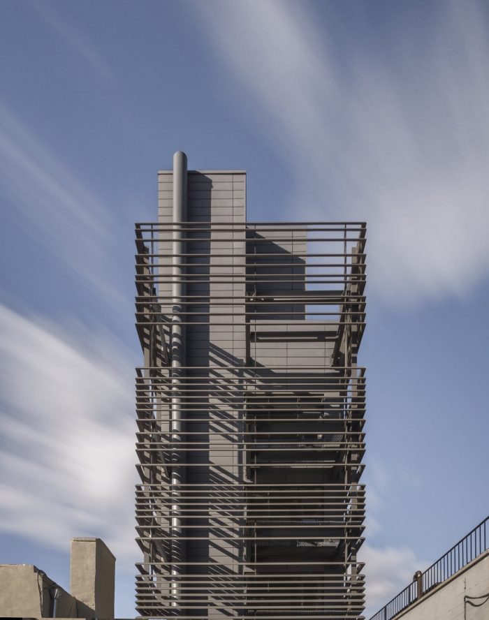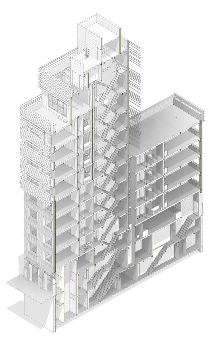 While we didn’t want to pretend the “base building” wasn’t brand new, we wanted the first five floors to pay homage to the existing masonry and stucco tenement neighbors. We clad the first five floors in handmade coal-fired brick and designed our own take on rusticated masonry details. Deeply framed glazing adds to the facade’s texture while mitigating solar heat gain and the skin reacts to the sun’s path throughout the day in a softly graphic way. We chose bricks that subtly change hue as the building rises until they closely match the cladding of the volume above. The upper part of the tower — the volume beyond the rooftops of the adjacent buildings — is clad in zinc panels which are then surrounded by a veil of louvers. While their primary purpose is — like the window boxes below — to mitigate solar heat gain, the louvers also serve as balustrades to the balconies, create extra depth in the facade, yield kinetic shadow play and obfuscate externalized mechanical components. The colors, proportions and textures of the two envelopes reference one another and are more like siblings than strangers.