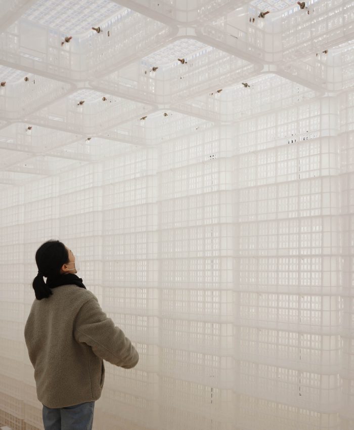 The project is about providing a new perspective on the everyday. As a flexible element rather than a fixed element, a Pavilion consists of 1,300 structural semi-transparent basket surfaces. A relatively standard commercially available basket was reused as a pavilion. The individual 1,300 baskets are also intended fore reuse upon dismantling the installation.
