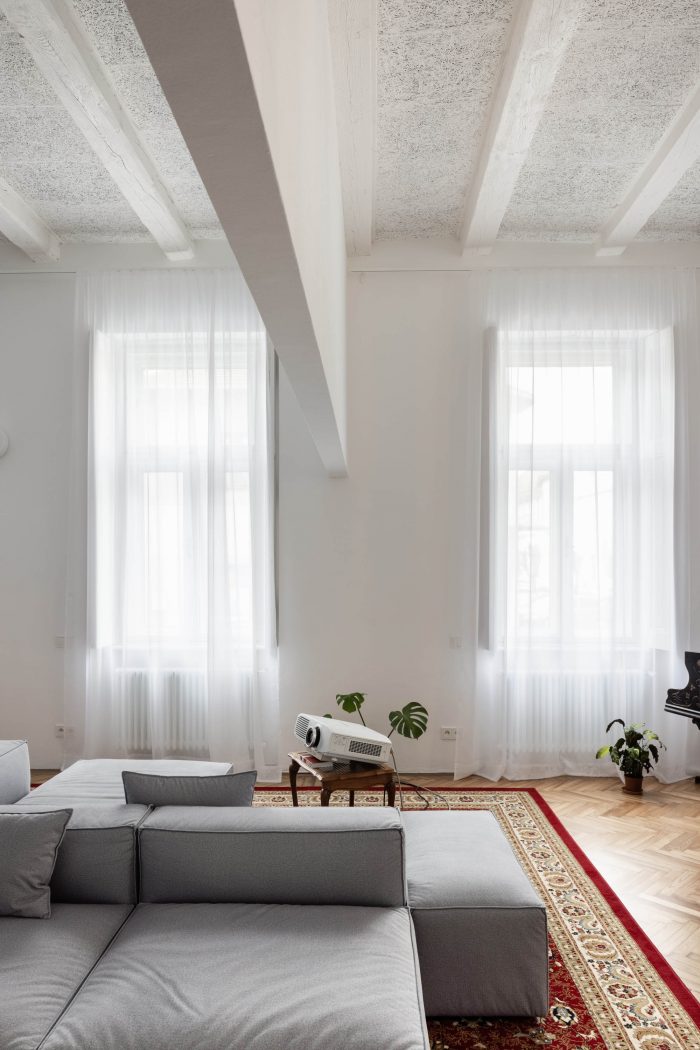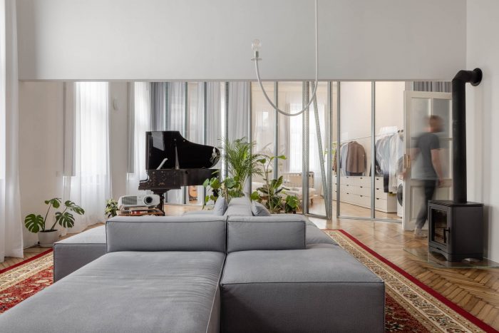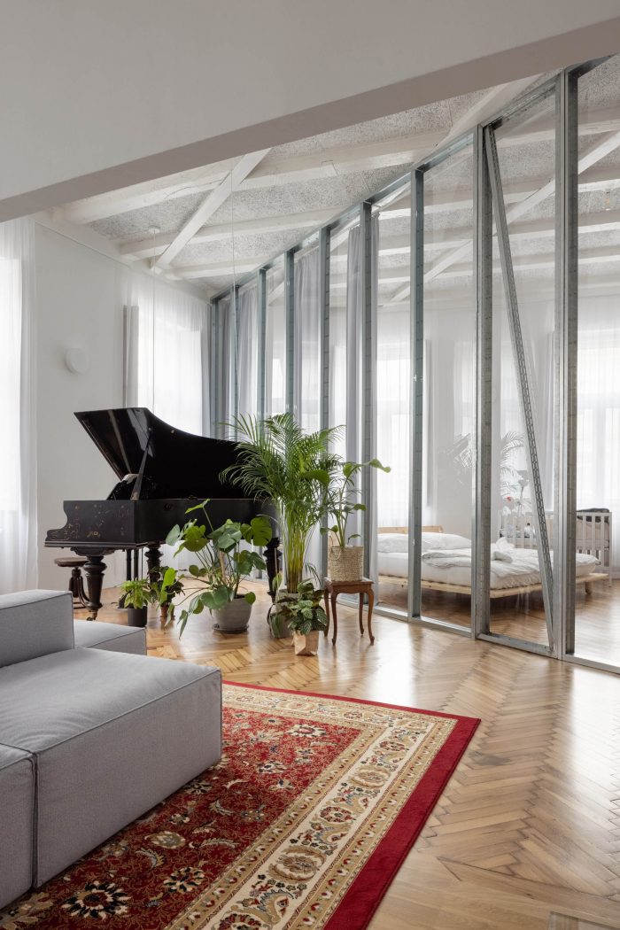 On the right you see a long transparent partition defining the bathroom, then continuing to the second wing of the apartment, in which it divides the bedroom from a large living room with a grand piano, interior garden, movie projection, and oven. We like the spatial depth we created in the apartment. We like the opportunity to see through more spatial layers. In the part of the apartment with a living room, we managed to uncover the original wooden beamed ceiling, over which, in addition, steel reinforcements pass. A flexible and open home for a young family in a house almost 120 years old.