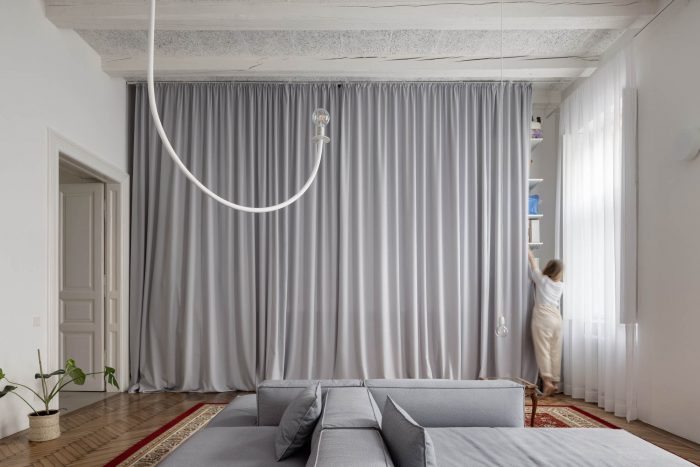 The spaces of the apartment are defined very simply with the transparent partitions with curtains, which allow you to perceive and enjoy the whole depth of the space, but at the same time provide enough intimacy if desired. The furniture defines just what is most essential and necessary.