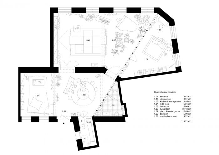 在右边,你看到一个长长的透明隔断定义了浴室,然后继续到公寓的第二翼,在那里,它将卧室与一个大客厅隔开,客厅里有一架三角钢琴、室内花园、电影放映和烤箱。我们喜欢我们在公寓里创造的空间深度。我们喜欢有机会看到更多的空间层次。在公寓的起居室部分,我们成功地揭开了原来的木质横梁天花板,此外,在其上还通过了钢筋加固。在一幢有近120年历史的房子里,为一个年轻的家庭提供了一个灵活和开放的家。