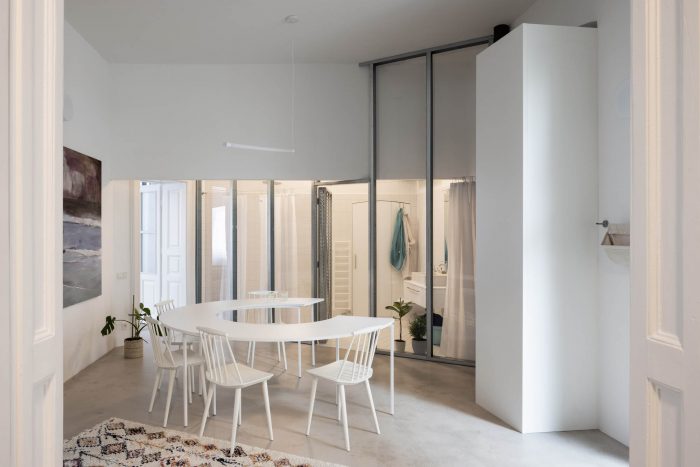 我们的意图是创造气氛,而不是严格意义上的预定空间。公寓从一个为房屋居住者服务的私人庭院进入。你会被一个大的餐厅所欢迎,厨房位于以前的储藏室的位置,它稍微延伸到餐厅。在左边,你可以通过一个嵌在透明隔板上的旧门进入一个儿童房。