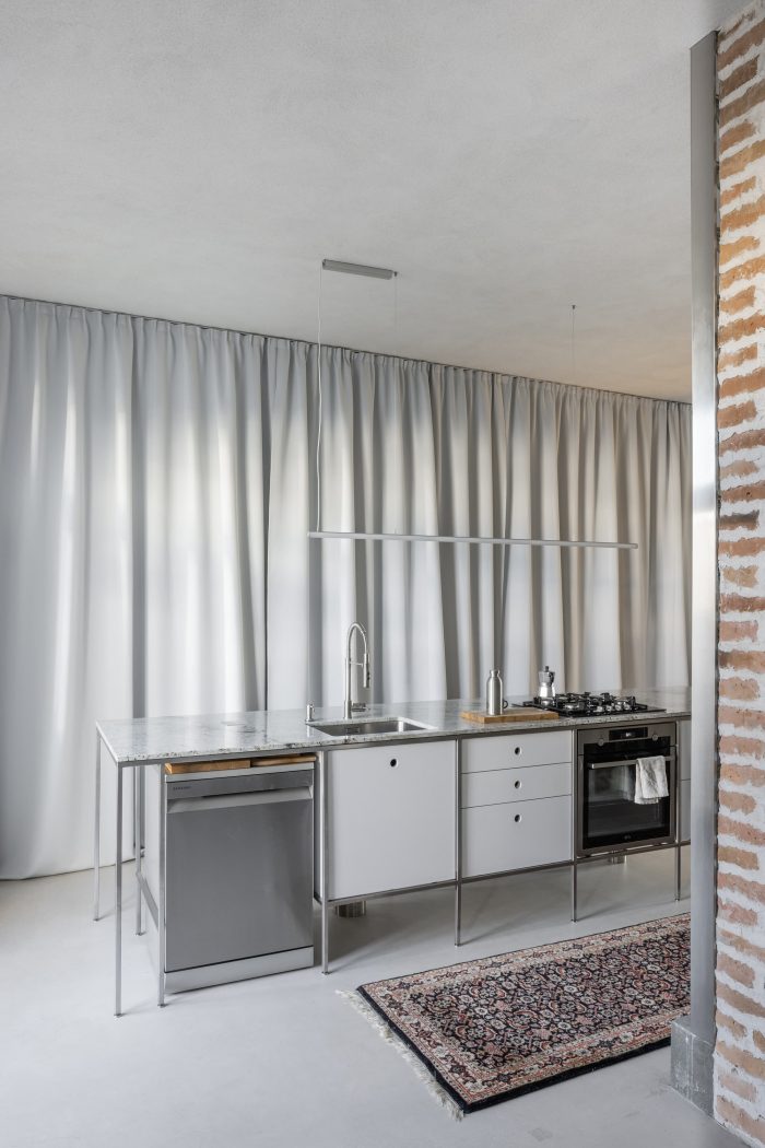 空间概念、价值的体现以及公寓的社会性都很明显。我们开放,消除障碍和去物质化,只增加必要的元素。我们希望有更多的空气、景色、感情和鲜花。一个共享时刻的框架。我们通过将空间运动分布在一个循环模式中,创造一个 "无限的空间"。我们不希望走到走廊的尽头,转身就回去了。