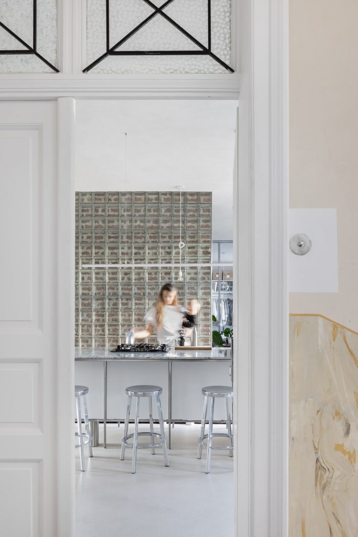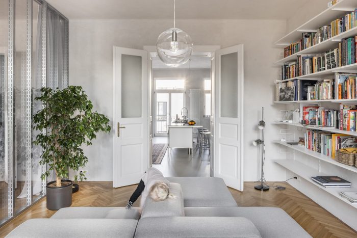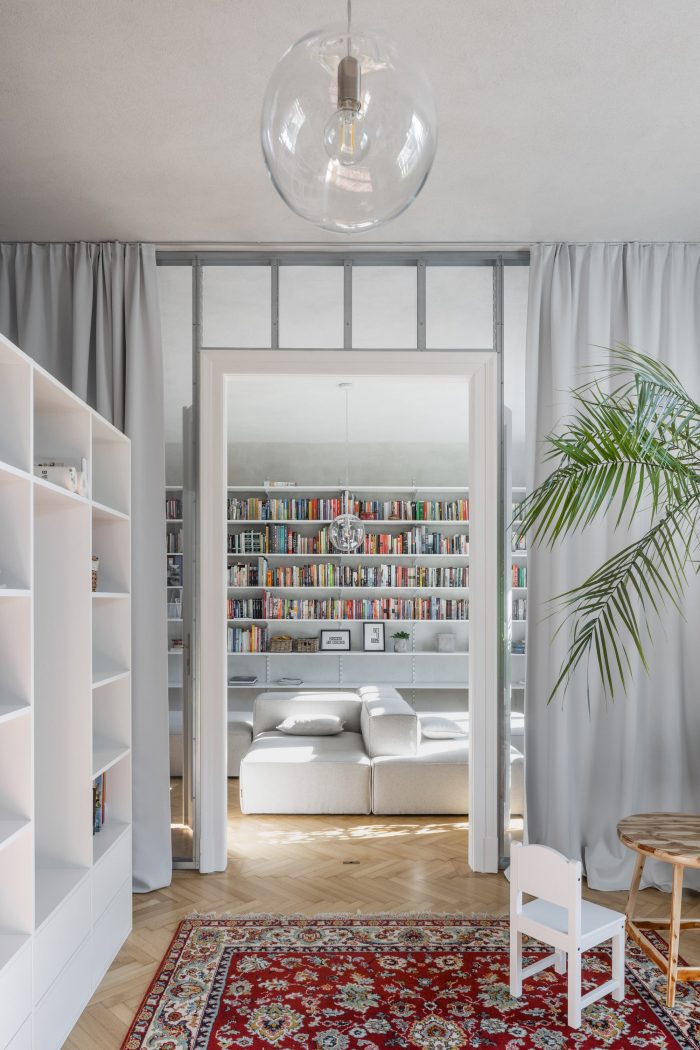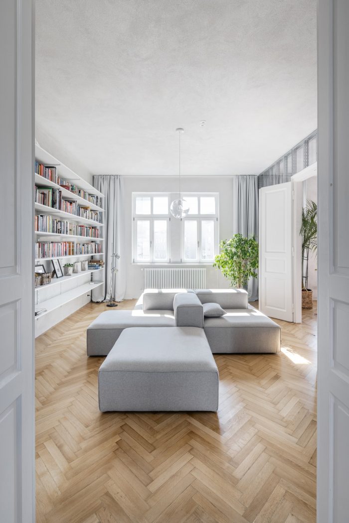 Joining of the original and the new. An apartment in the city center from the late 20s for a growing family. The apartment is divided into two tracts. The southeastern tract with transitional rooms, original wooden floors, and double-wing doors.
