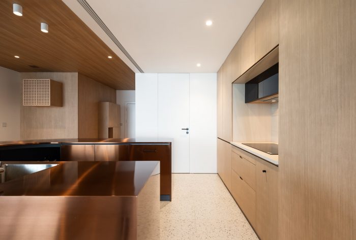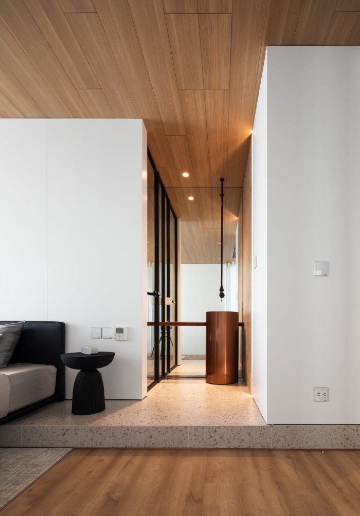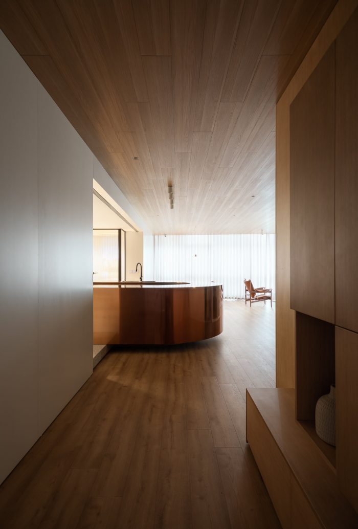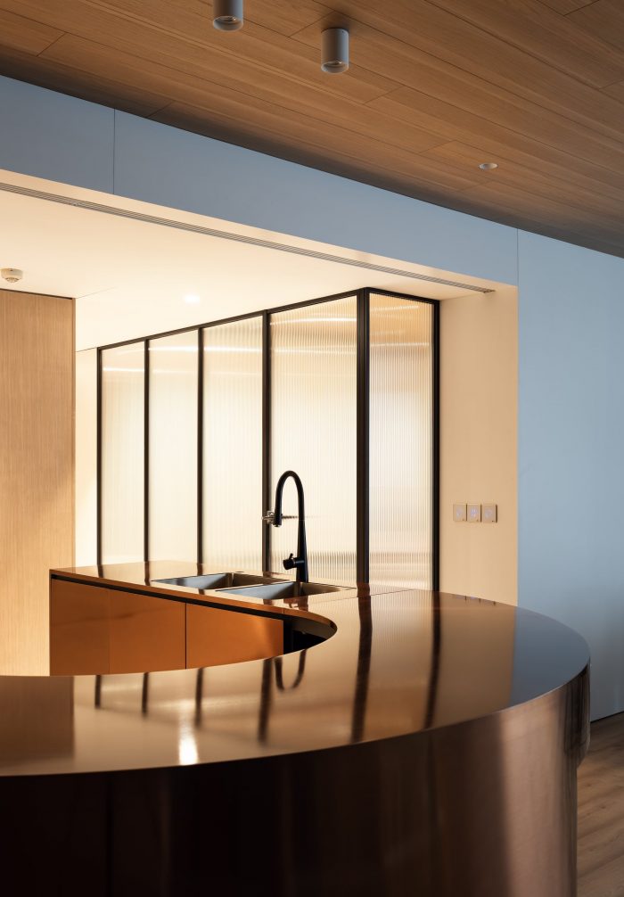 The main entrance of apartment is blocked by the bar (also the kitchen island). We want the hall will lead people into the spaces gradually, not directly. Evoking curiousness then bursting by the context. Talk about the kitchen island, it made from brushed copper monolithic. With an unique design and a shiny material the bar become highlight of apartment.