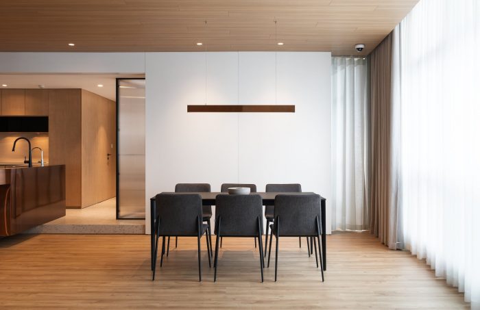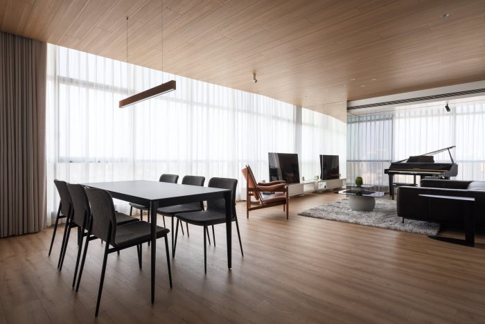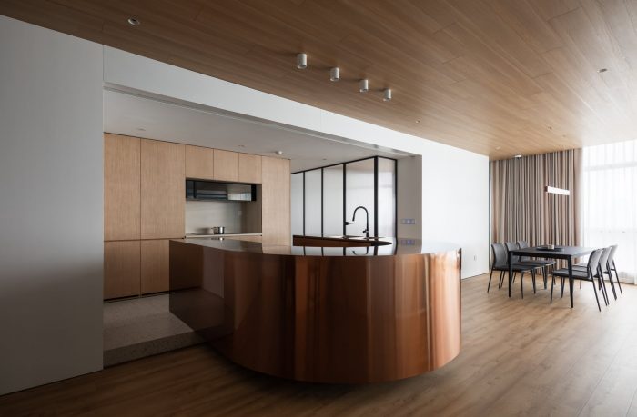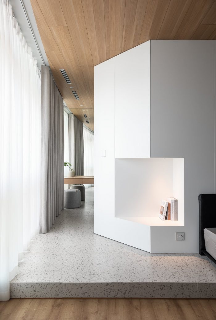 这个公寓的主人告诉我们,他喜欢音乐,他希望有一个生活空间,但也是一个娱乐室,以享受声音和葡萄酒。我们的解决方案是重新安排计划,拆除一些墙壁,使之成为一个开放的生活空间。我们用1/2的面积做厨房和客厅,也把它们放在公寓的中心。我们称其为 "放松空间"。混凝土墙似乎是这个公寓的一个弱点,但是,我们认为如果把它变成一个镜面包层会很好。事实上,镜面墙的效果非常好,它在空间中创造了一个平视点,没有起点和终点。主人房和卧室最好的部分是,我们使用磨砂玻璃作为房间的隔断。对空间的影响是带来了从东到西的无尽视野,使家庭成员始终保持联系。
