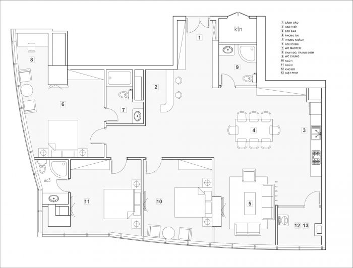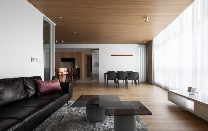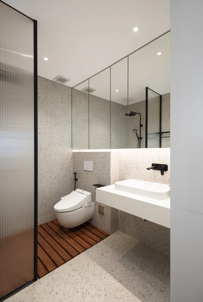 The owner of this flat told us, that he loves music and he wants a space to live but also an entertainment room, to enjoy sound and wine. Our solution here is rearrange the plan, remove some walls to make an open-living space. We use 1/2 area for kitchen and living room, also placed them in center of apartment. We called that a "chill out space". A concrete collum seem a weakness of this flat, however, we thought it would be great if turned it into a mirror cladding. In fact, that mirror collum work really well, it creat a paranoma view in spaces, there is no start or end point. Best part of master and bedrooms is that we use frosted glass as the room divider. The effects on spaces are bring out an endless view from East to West and keep family members always connected.