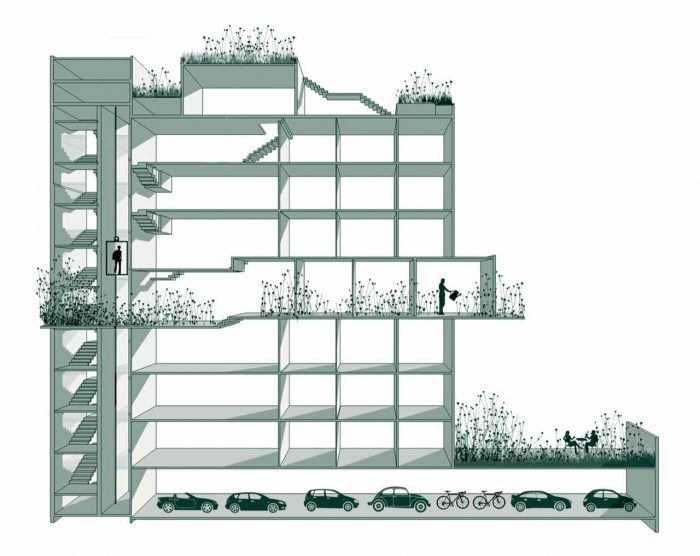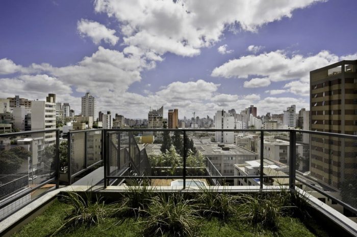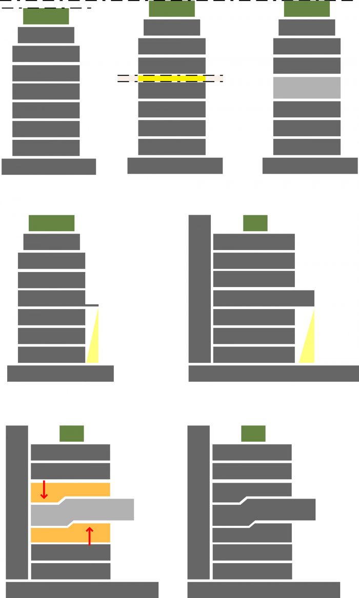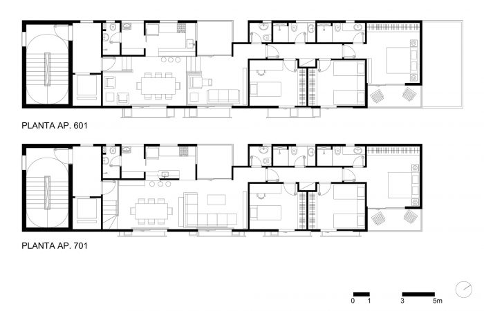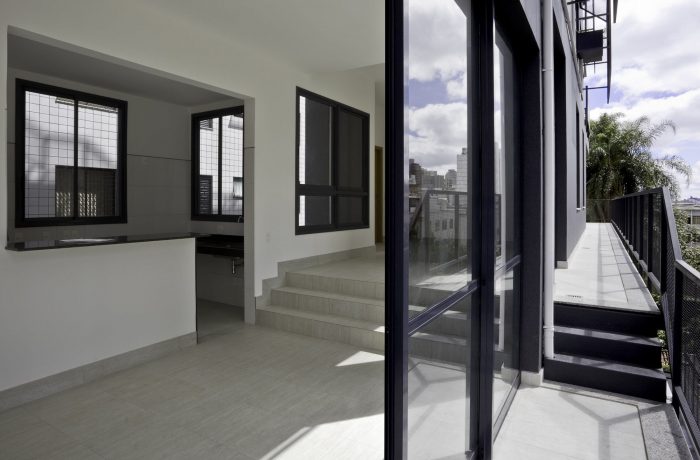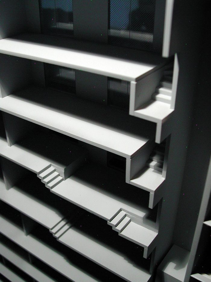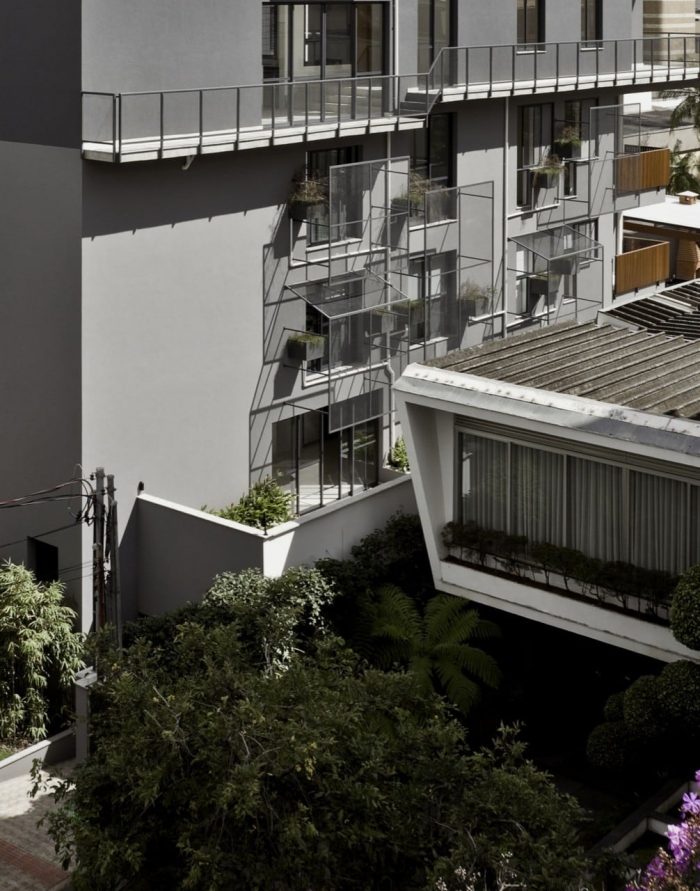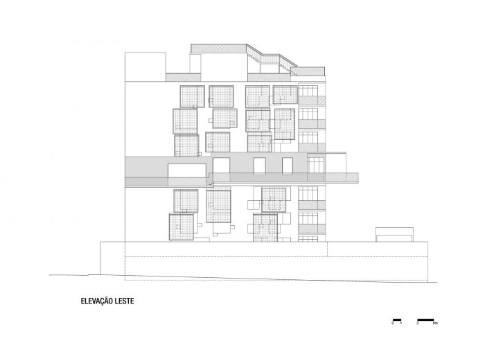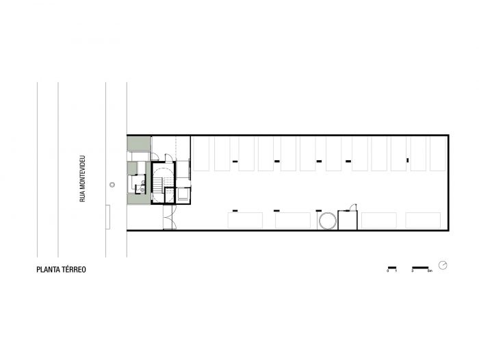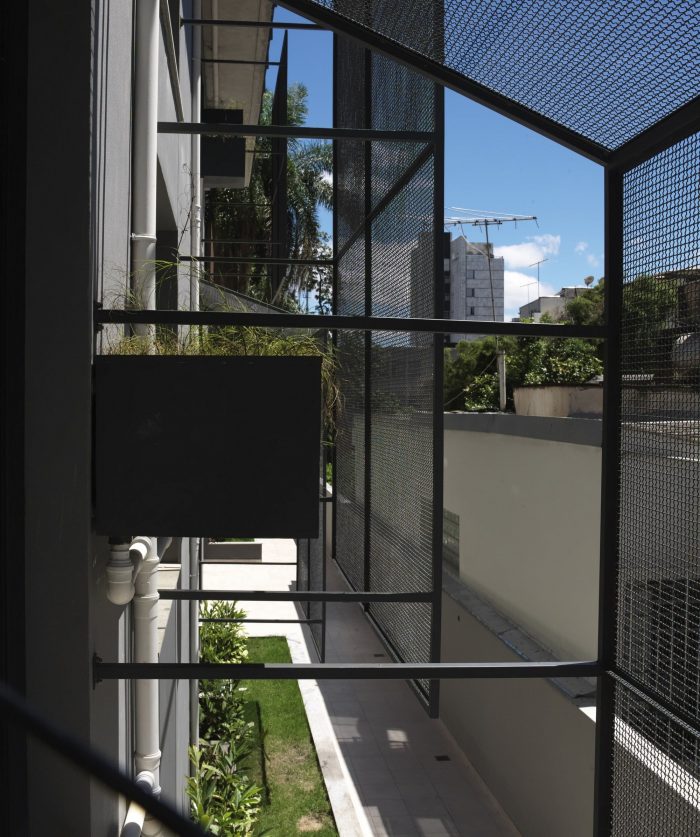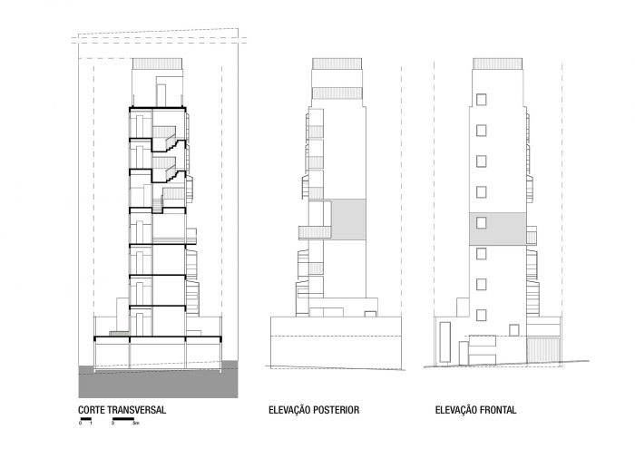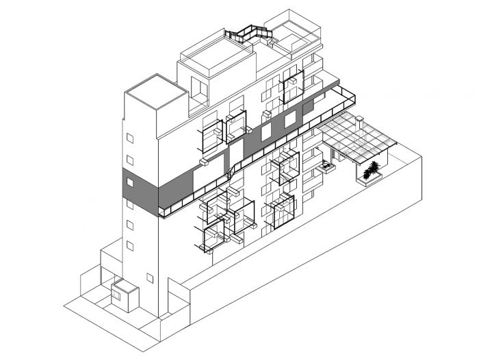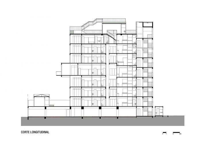285 Montevideo is a cobblestone as a consequence of the envelope determined by the strict local Building Regulations. An apartment has a larger plan (5th floor), with the cantilever toward the only side of the volume not bounded by the Building Regulations (the backyard). In section, the project explores the maximum height allowed by the Regulations and generates differentiated ceiling heights, with three-step stairs inside the rooms resembling the internal spaces of a house; and a 3m cantilever accentuating the 5th floor’s differences (larger windows, larger ceiling height, larger bedroom, balcony, etc).