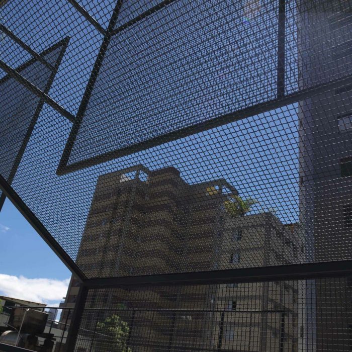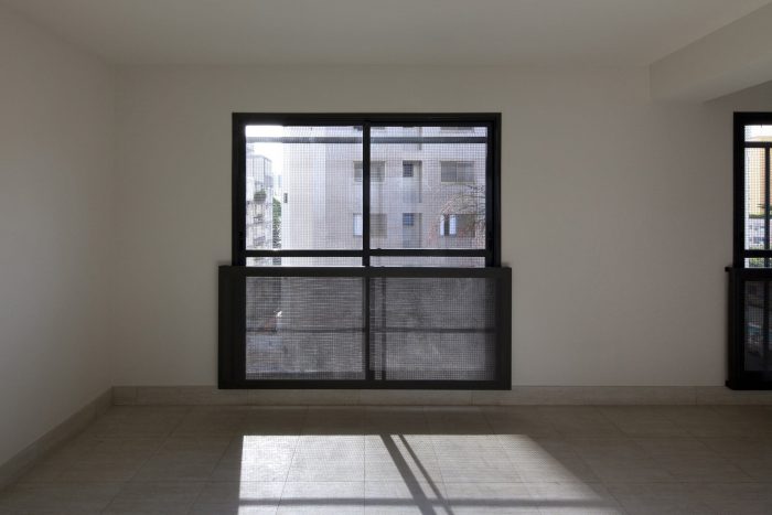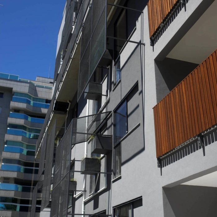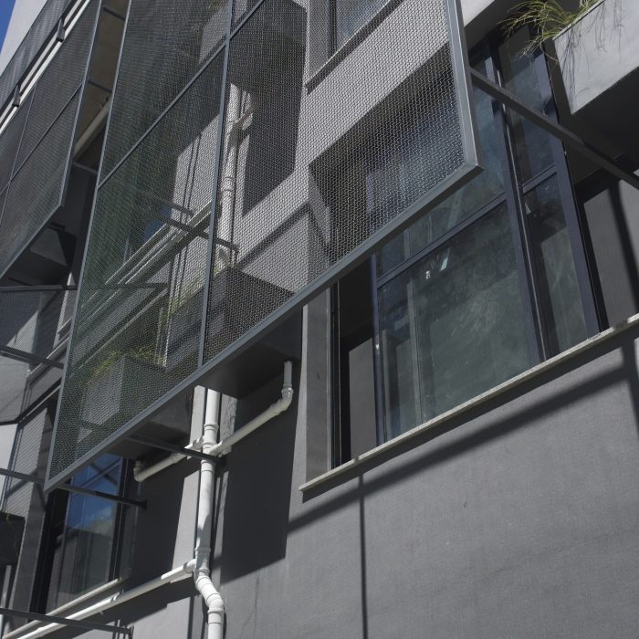 All the rooms (living rooms and bedrooms) face the morning sun and are protected by metal grilles that work as sun shades and elements to provide privacy vis-à-vis the close neighbors. Kitchen and toilets face the (hot) west side, yet a building block 6m away protect them from the west considerably.