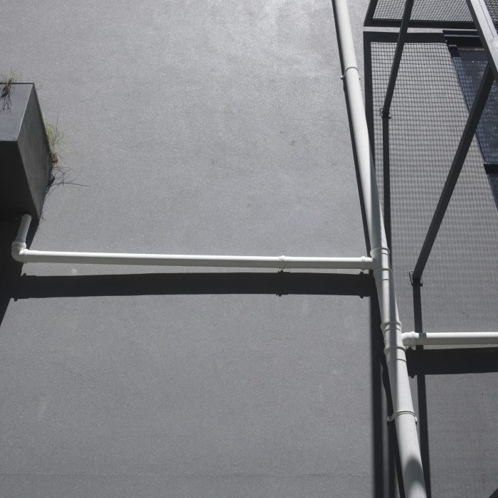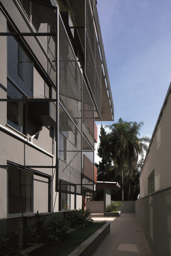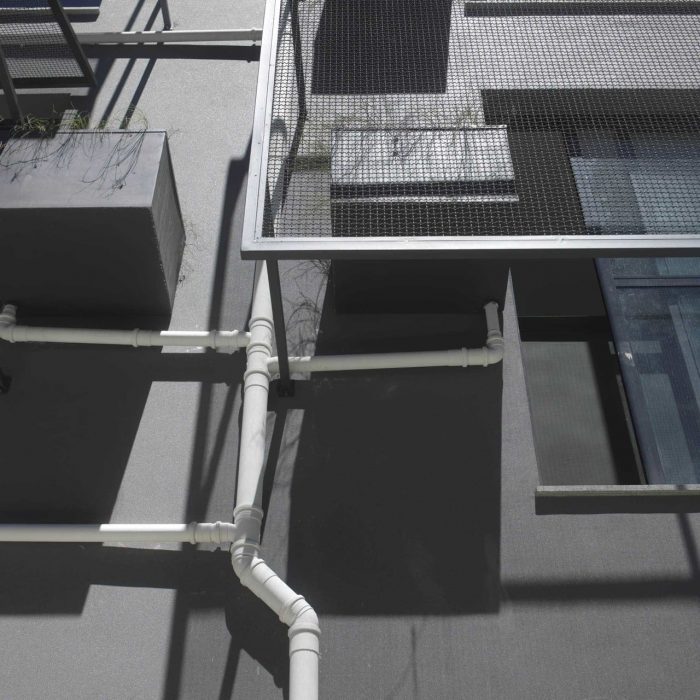 The façade has planting boxes with white drainage pipes; the grilles sunshades also working as support for the fountainbushes’ (Russelia equisetiformis) growth.