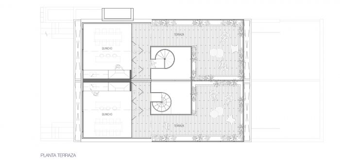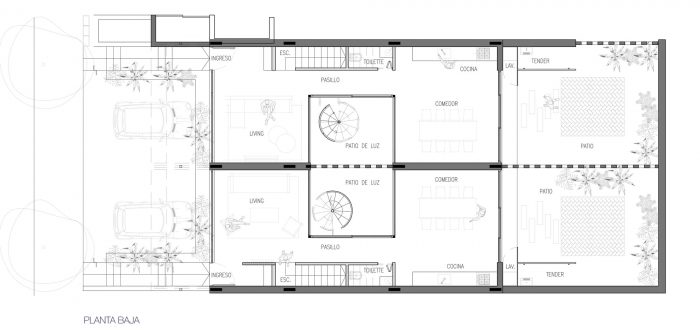 A dense program on a narrow north-south lot that used to be a soccer field, two paired three-level houses - triplex - are developed both vertically and horizontally, directing the program towards the backyard reformulating the typical model of Argentinian casa de medio patio (half patio house), where the void of the patios is the main articulator of all the interior spaces.