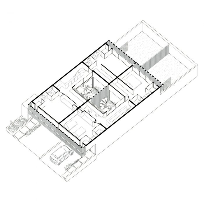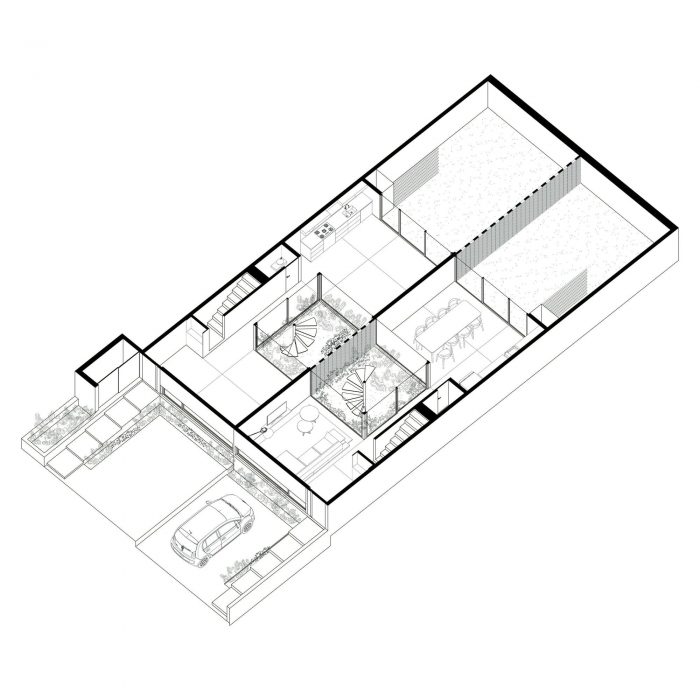 第一层沿三个天井衔接,浓缩了日常休闲活动:客厅、厨房和餐厅,以及后面的服务点。前面的通道停车天井,中间的绿色天井作为两栋高层辣妹屋的垂直连接,后面的天井则结合了植被和休息空间。