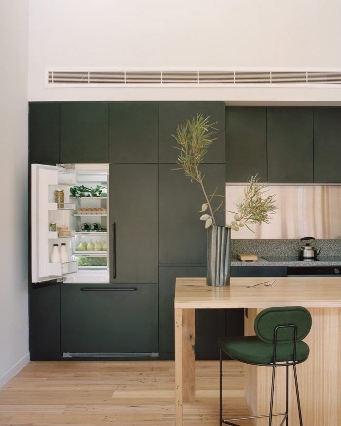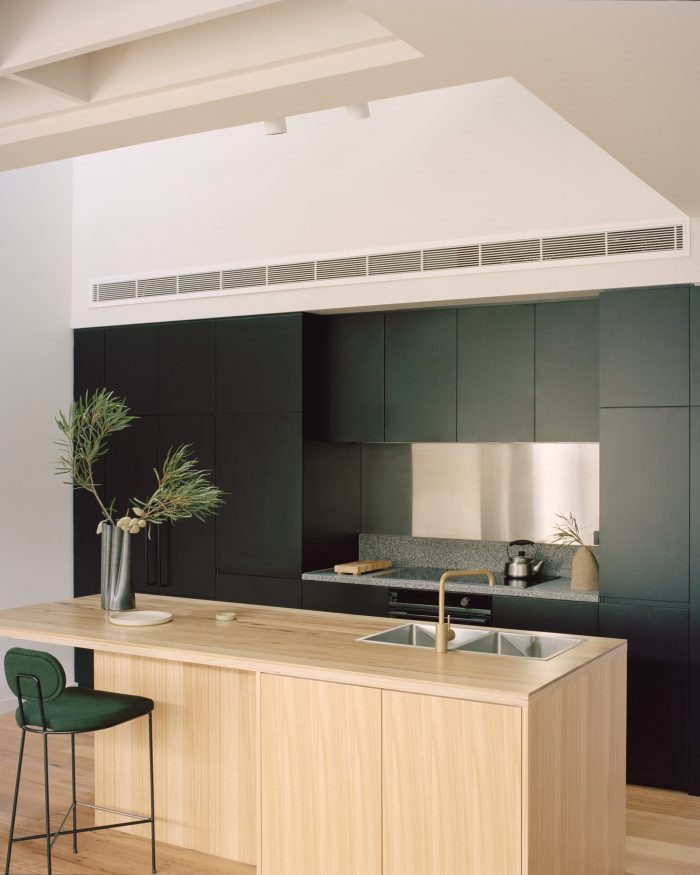 From the earliest discussions, the design was informed by surrounding historic housing as well as details within the existing building to ensure the renovated warehouse still connected strongly to the neighborhood character of Brunswick. Apartment widths and layouts draw from the pattern of terraced housing; window articulation from surrounding houses of the 1970s; new ground-level security screens reference the existing metal windows; and external timber fins emulate the pattern of wall niches left by the original timber roof beams.
