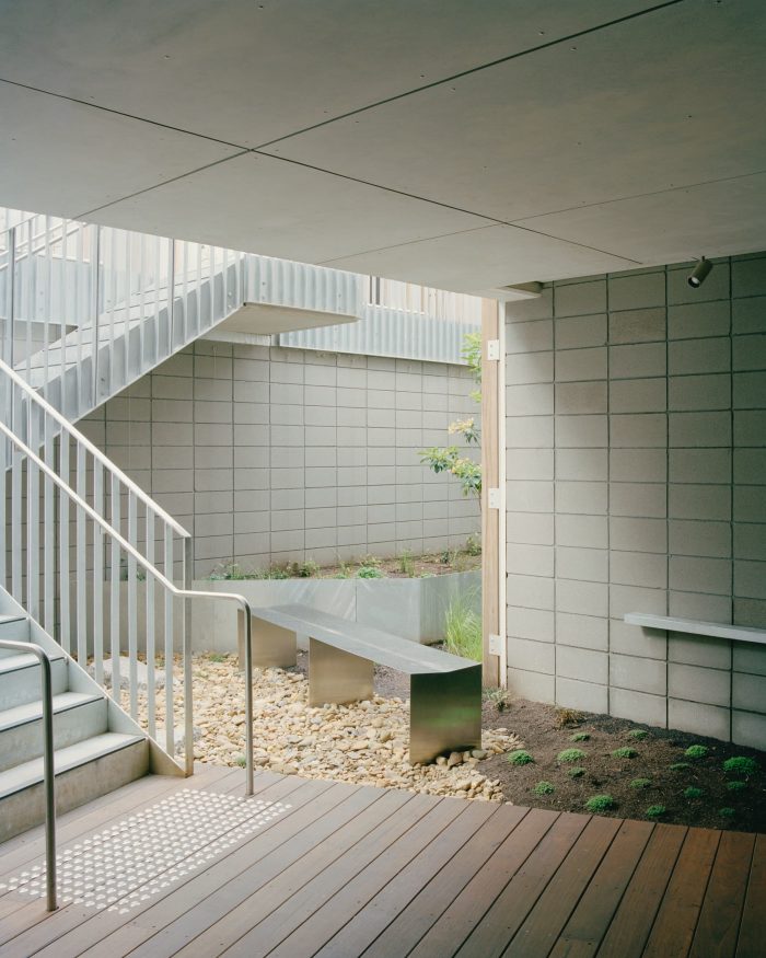 The new building addition sits sensitively within the preserved brick shell and comprises two volumes separated by a landscaped external atrium. This helps to naturally light and ventilate the dwellings, creating a sequence of open-air, planted spaces that connect all the apartment entries and provide meaningful contact with gardens when traveling through the building.