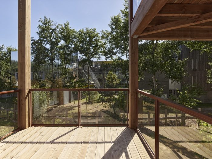 The fence of the college is covered with climbers, in order not to create a too important opposite. The lateral separations of the parcel are made of wooden fencing, thus respecting the spirit of the district and the recommendations of the urban planners. A vegetal atmosphere. The plantations chosen on the site correspond to typical undergrowth vegetation, adapted to the local environment. The remote areas are composed of perennials and shrubs requiring little maintenance and taking into account the seasonality of the vegetation. The plant palette, composed of ferns, acanthus and bellflowers, reflects the atmosphere of the undergrowth. In addition, the proposed plantings encourage the diversity of foliage and ensure a high level of comfort for the first floor. The trees near the southern limit of the island are preserved. In addition to the existing tree stratum, 25 new trees are planted, using local species such as hornbeam or country maple.