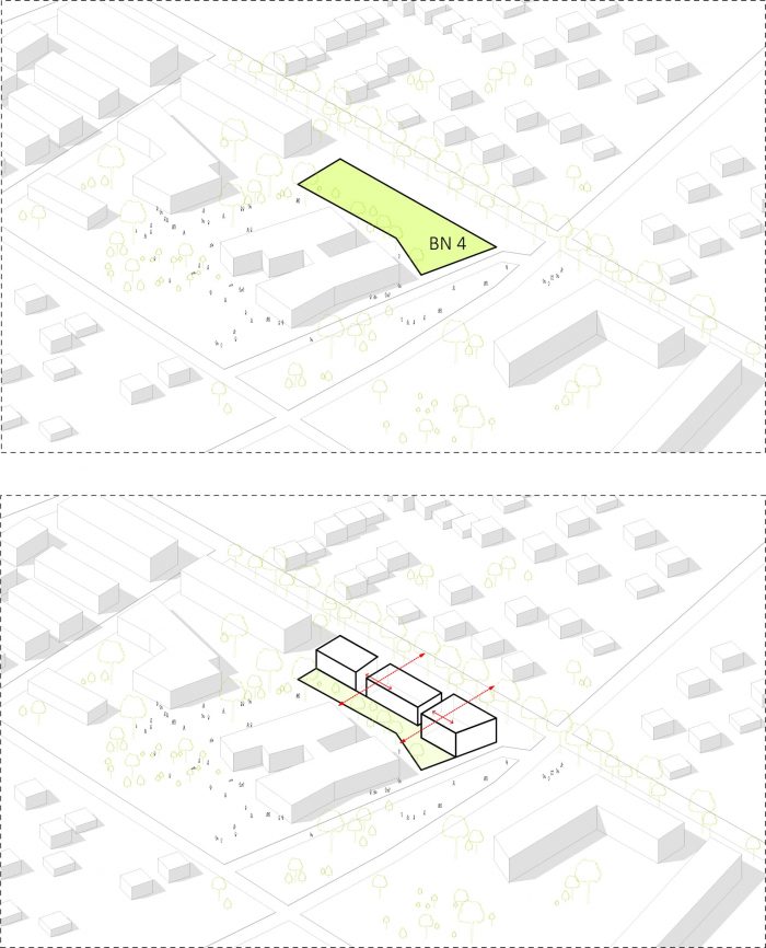 在每个项目上,我们都会专门研究背景。我们对项目的近、远、历史和社会学环境特别感兴趣。这些数据 "喂养 "了设计,并共同形成了一个架构。由于我们发展的背景很少是同质的,我们的写作往往是混合的。ZAC Erdre-Porterie位于南特的极限附近,靠近奇特的自然景观。这里有重要的林区:保护该地的品质是该行动的挑战之一。BN4街区位于北面的林间步行道和南面的新学院庭院之间,那里保留了许多树木。