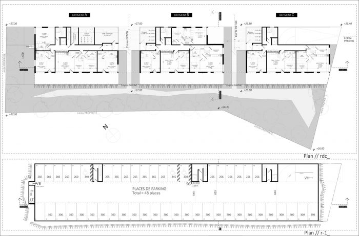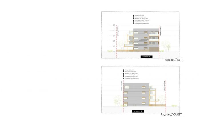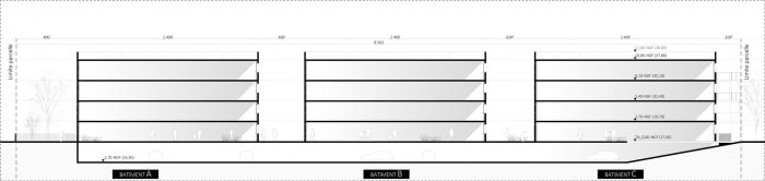 Implantation. This plot, a true place of urban sewing is imagined to be more sustainable, more desirable, more open to the landscape and its environment. The presence of numerous visual transparencies generates a porosity within the site itself. This feature facilitates the appearance of new uses. The issues of urban density and environment are also distinctive elements present in the project. The project is devided into 3 distinct elements. This arrangement allows the creation of porosities throughout the island and the sequencing of the buildings. The heart of the plot retranscribes the wooded environment of the site, through the creation of a wooded meadow. It composes a decor that will be seen by the inhabitants from the terraces. Without creating a large number of uses, it is above all a constituent of the exterior atmosphere of the dwellings. The breakthroughs from the street leave perspectives towards this space, allowing visual continuity with the neighbourhood environment.