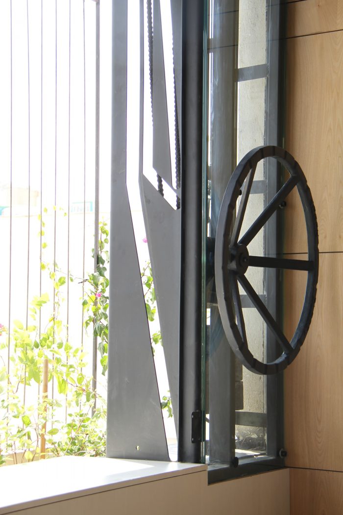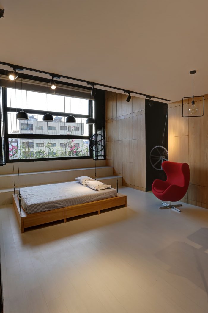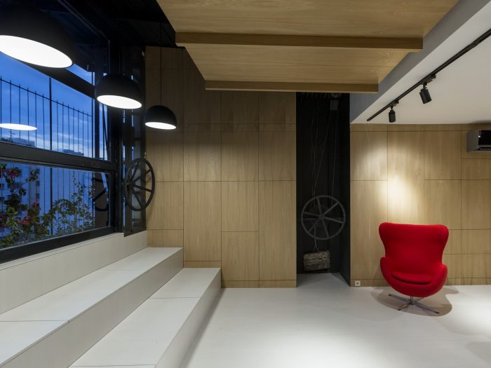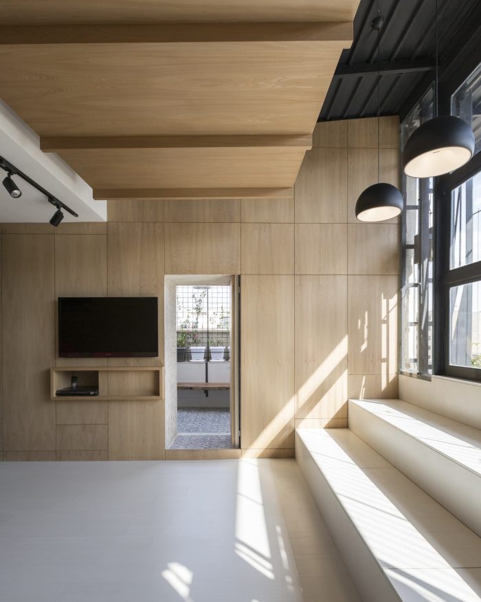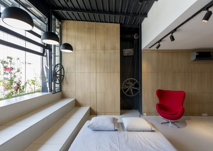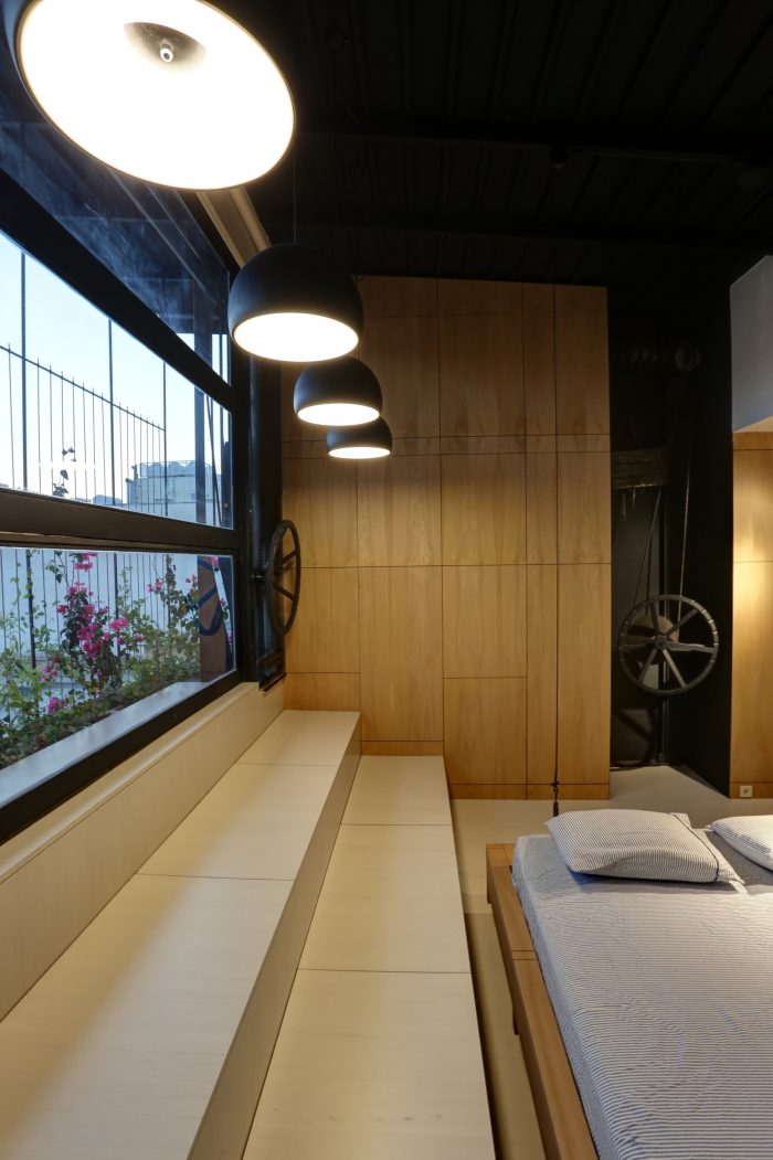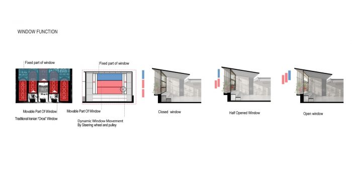 The initial area of the project was 30 sqm in order to increase the space, we expanded the space toward the south edge of the building to achieve a 45 sqm. space and also a better exterior view. At the additional space, the roof was moved one meter above the main roof to gain more air circulation and also more space for the house furniture. Finally, the slope of the additional space roof was the response to indigenous climate (Sunlight & rain) and structure challenge. A three-piece all glass window of this suite is inspired by ancient house windows “Orosi”. By opening the window with a pulley and a steering wheel, there will be no boundaries between inside and outside in order to create an independent connection to outside.