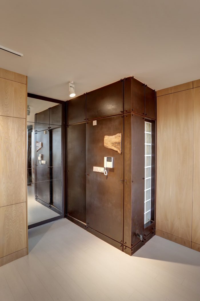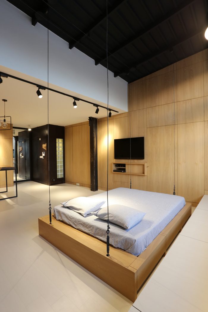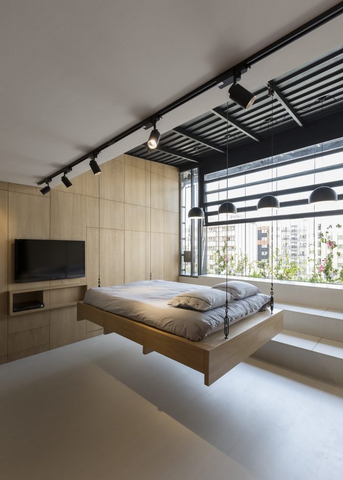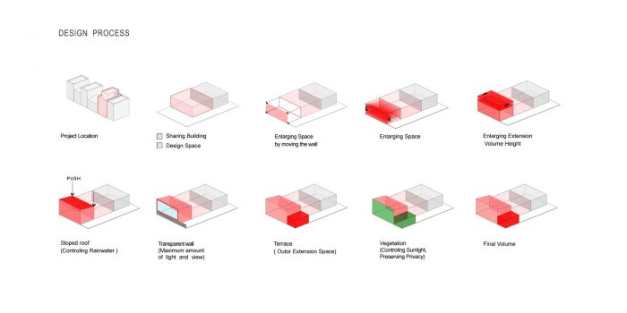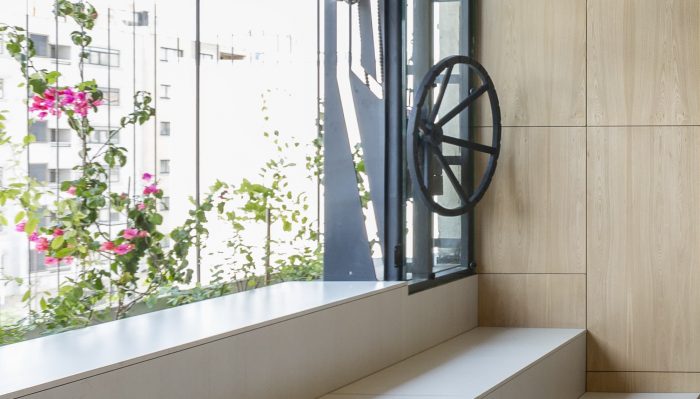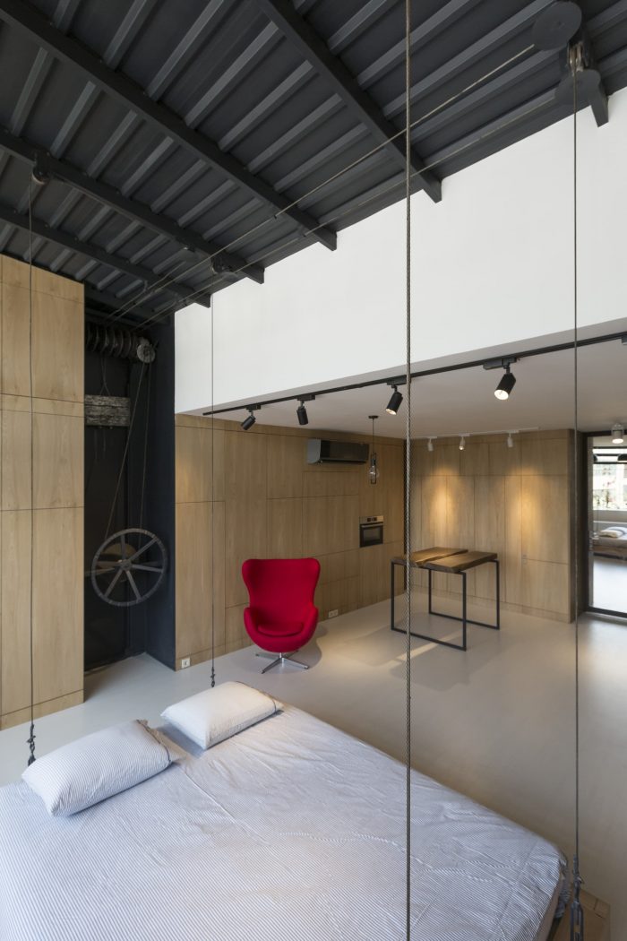 The initial area of the project was 30 sqm in order to increase the space, we expanded the space toward the south edge of the building to achieve a 45 sqm. space and also a better exterior view. At the additional space, the roof was moved one meter above the main roof to gain more air circulation and also more space for the house furniture. Finally, the slope of the additional space roof was the response to indigenous climate (Sunlight & rain) and structure challenge. A three-piece all glass window of this suite is inspired by ancient house windows “Orosi”. By opening the window with a pulley and a steering wheel, there will be no boundaries between inside and outside in order to create an independent connection to outside.