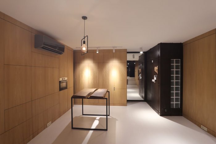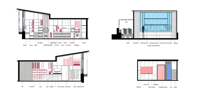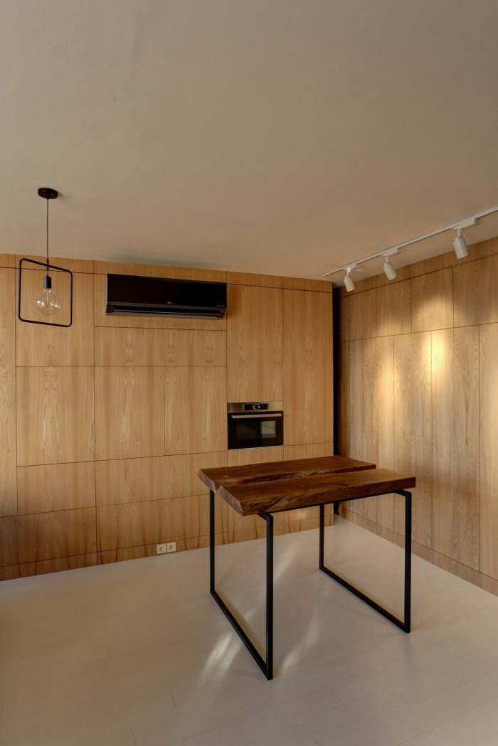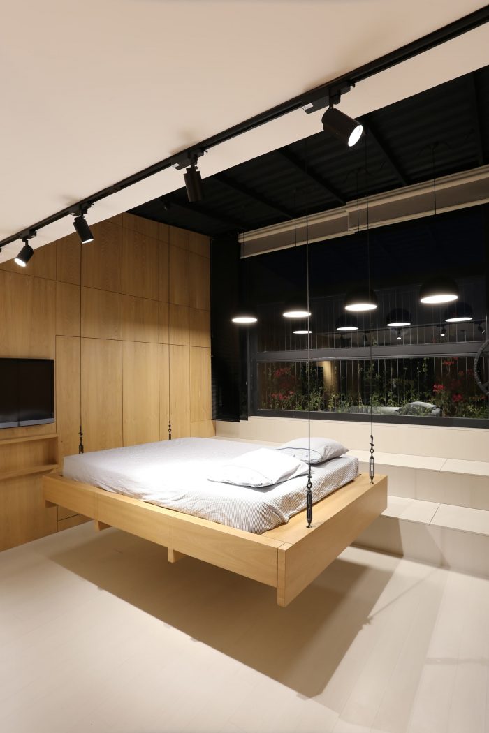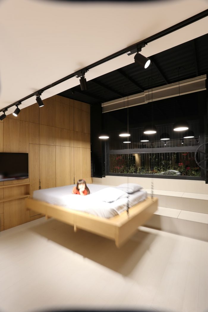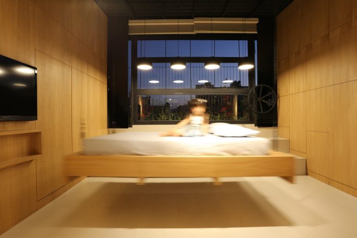 The interior was designed in a way that provides the possibility of the entire day and night activities. All of the service spaces such as cooking, fridge, washer dryer, closet and storage spaces were embedded in the perimeter surface of the suite, however, they all can be hidden with retractable doors in order to have the possibility of changing the space.