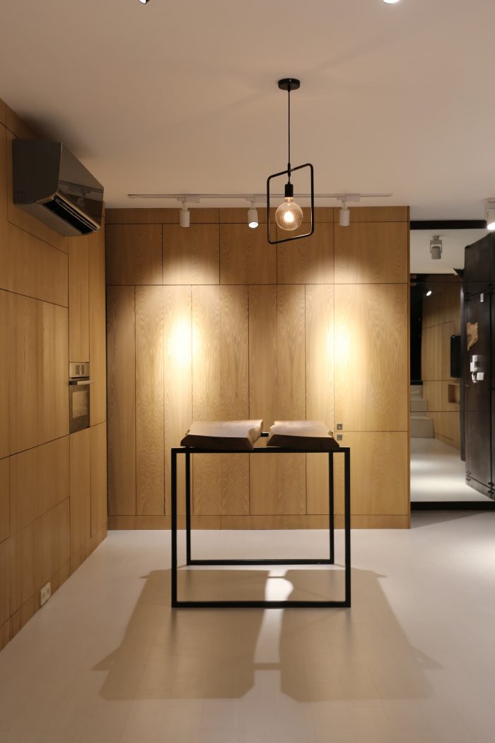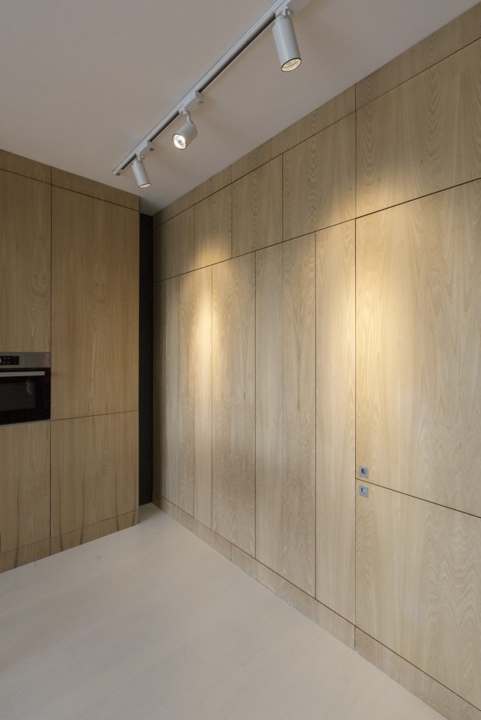 室内设计的方式提供了整个白天和夜晚活动的可能性。所有的服务空间,如烹饪,冰箱,洗衣机烘干机,壁橱和存储空间都嵌入在套房的周边表面,然而,他们都可以用可伸缩的门隐藏起来,以便有可能改变空间。