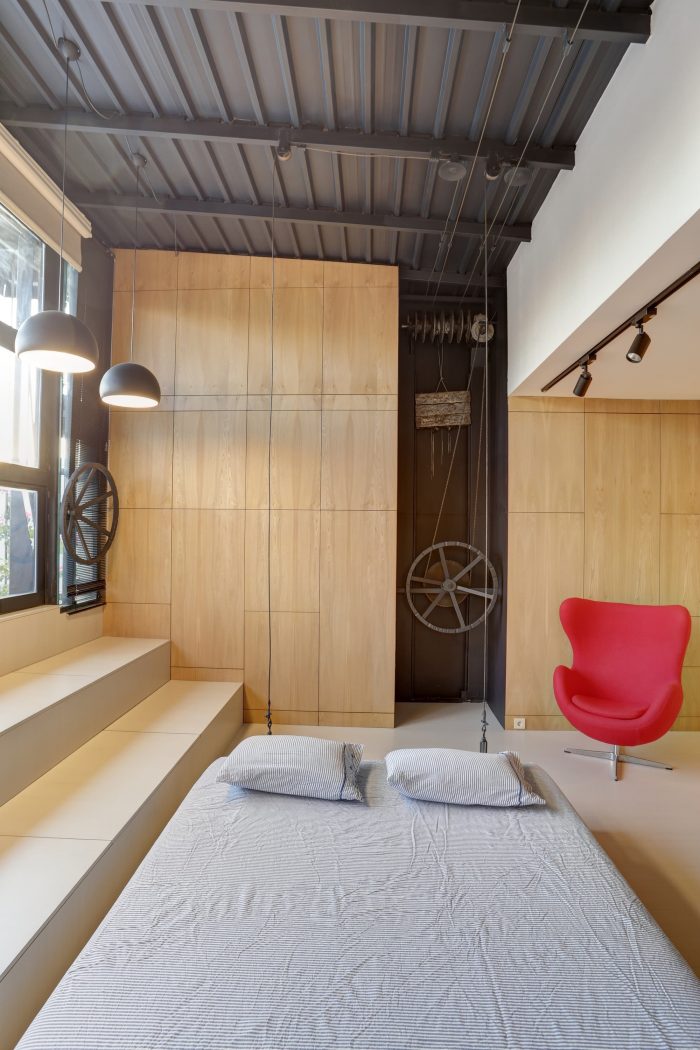 这个项目的目标是将一个住宅公寓屋顶上的现有仓库改造成一个宜居的地方。考虑到现有的空间非常有限,设计团队最初的概念是在这么小的空间里整合所有住宅所需的空间。与典型的将空间划分为不同的空间,每个空间用于一个特定的活动的过程不同,45平方米的住宅提供了一个单一的空间,根据不同的功能和活动不断变化。