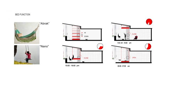 An island table with multiple purpose function was designed for dining, reading, working and other daily activities. In order to create a continuity between the floor and the perimeter walls and surfaces and a gradual connection of them, a two-level seating was created at their intersection. This place not only creates a sitting area but also can be used as a storage space. The bed inspired by “Abrak”, ancient swings in Shiraz, is utilized to create a dynamic movement to hide into the height difference of the newly added roof based on the need.