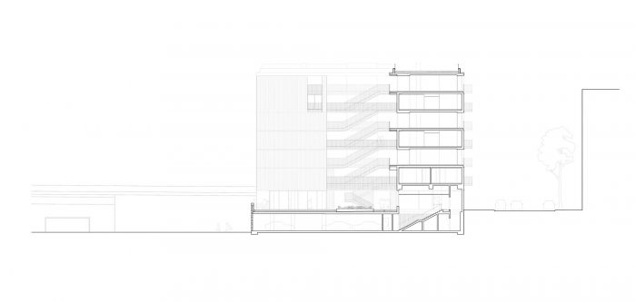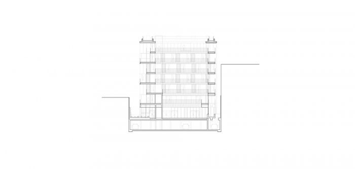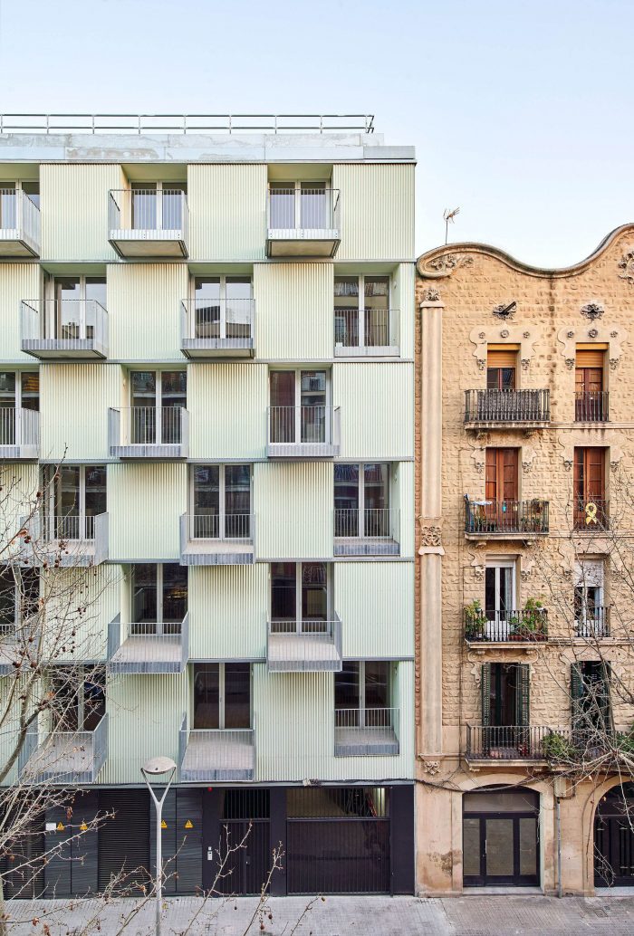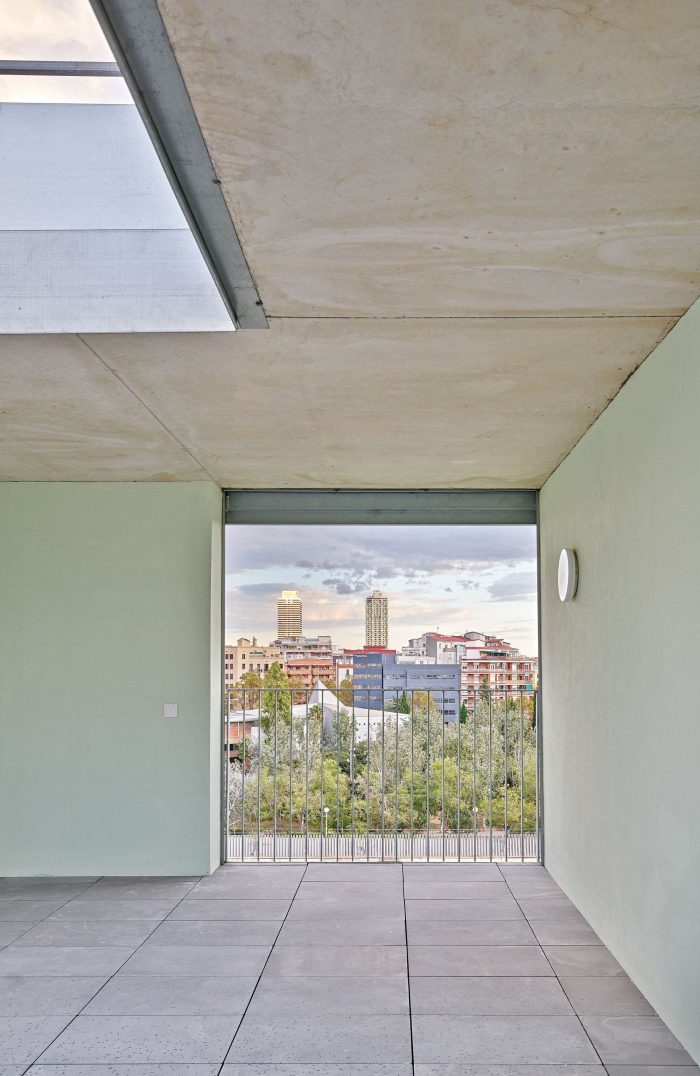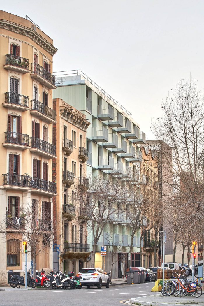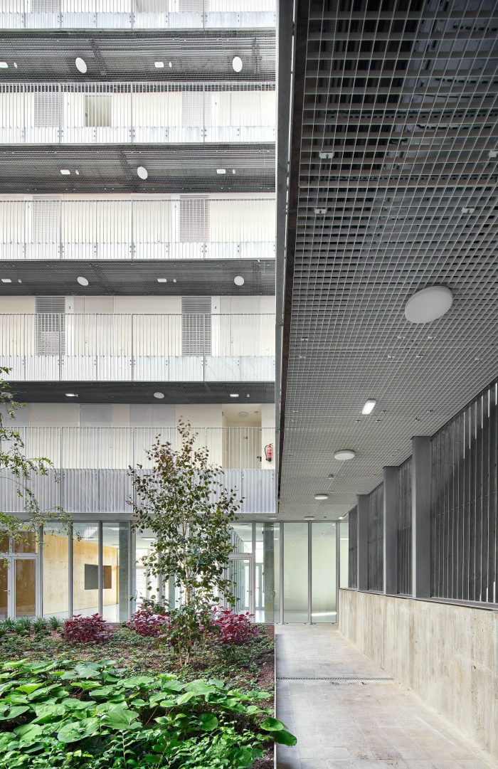 The project is located in a singular block of the Eixample district, formerly fragmented by the railway and currently opened to new public spaces. Two separate volumes define a large green central courtyard and circulation areas. The building facing the street consolidates the front of the block and the second one is conceived as an isolated building, even separating itself from the limits of the plot to respond to the existing irregular urban voids.