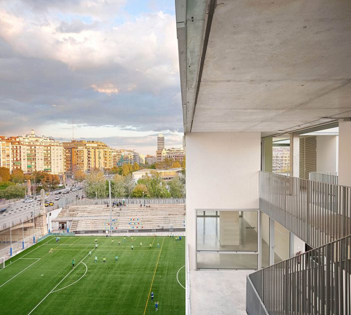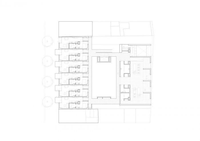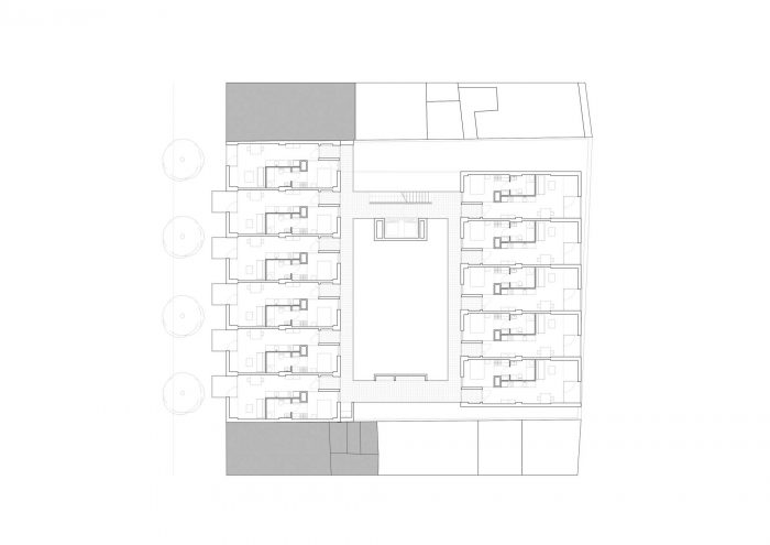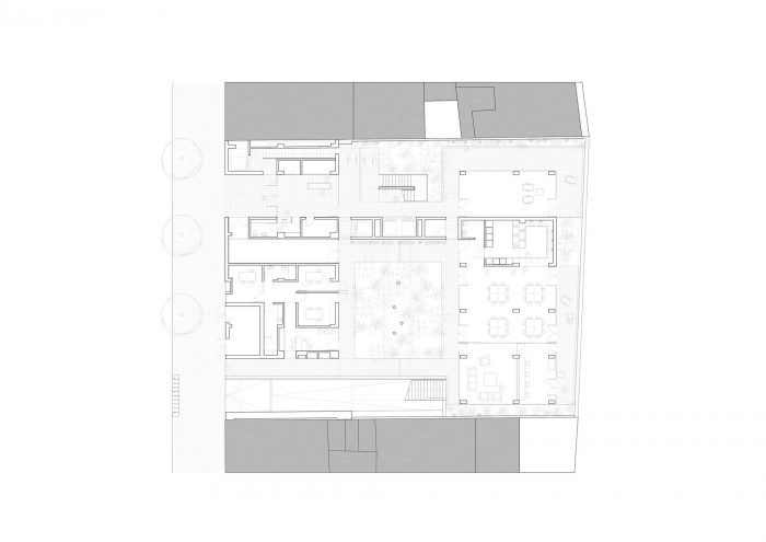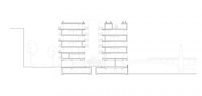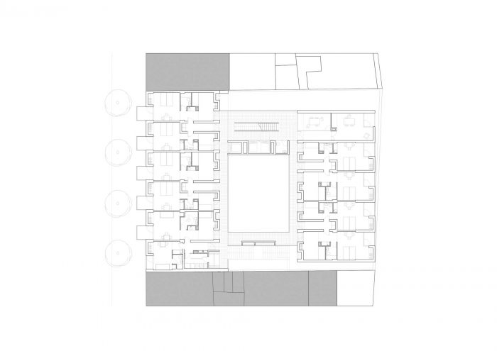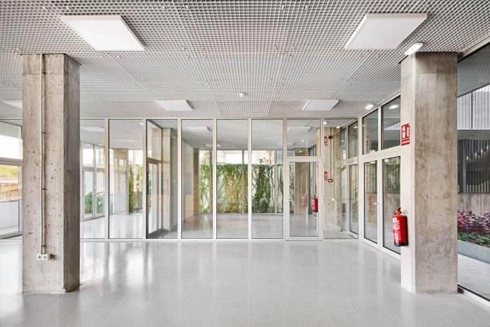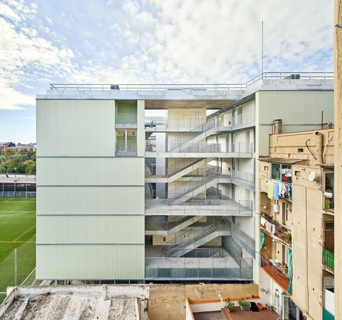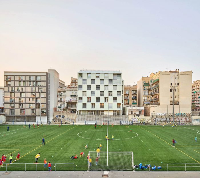 The project is located in a singular block of the Eixample district, formerly fragmented by the railway and currently opened to new public spaces. Two separate volumes define a large green central courtyard and circulation areas. The building facing the street consolidates the front of the block and the second one is conceived as an isolated building, even separating itself from the limits of the plot to respond to the existing irregular urban voids.