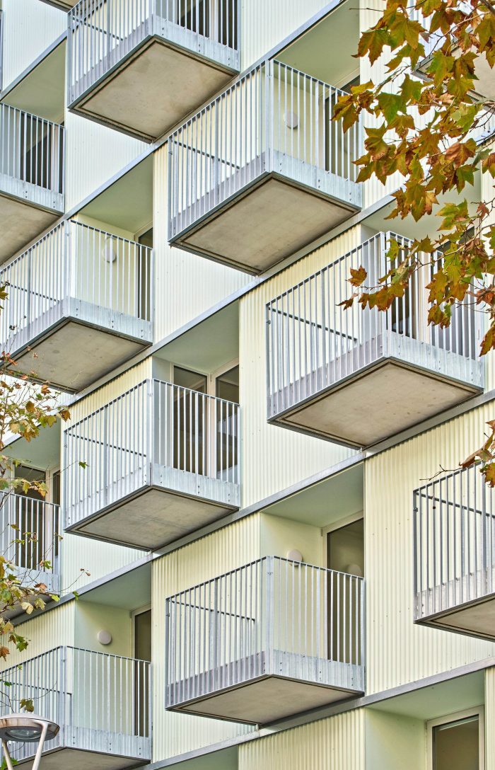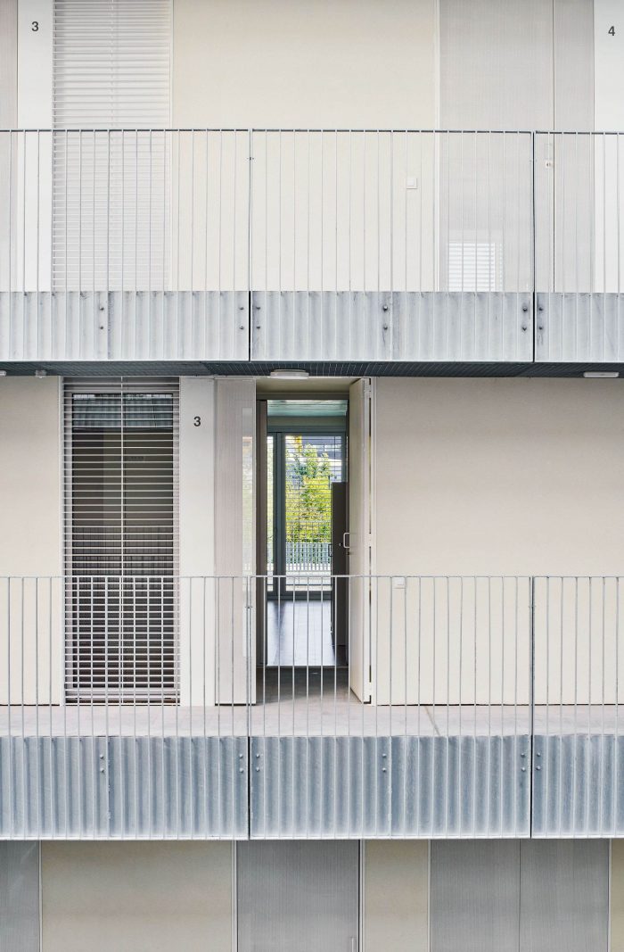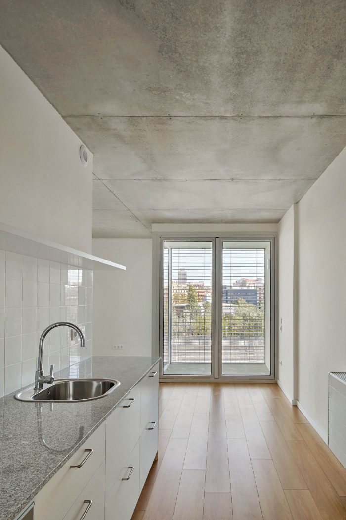 The single bedroom apartments for the elderly are cross ventilated, with access through an open walkway and entrance gate, an intermediate space that allows the appropriation of the common space and regulates the apartment’s privacy. From the central kitchen the spatial perception is extended by oblique views towards the living room and bedroom with a large sliding door. The terraces extend the living rooms to the outside.