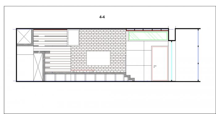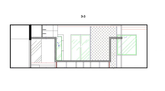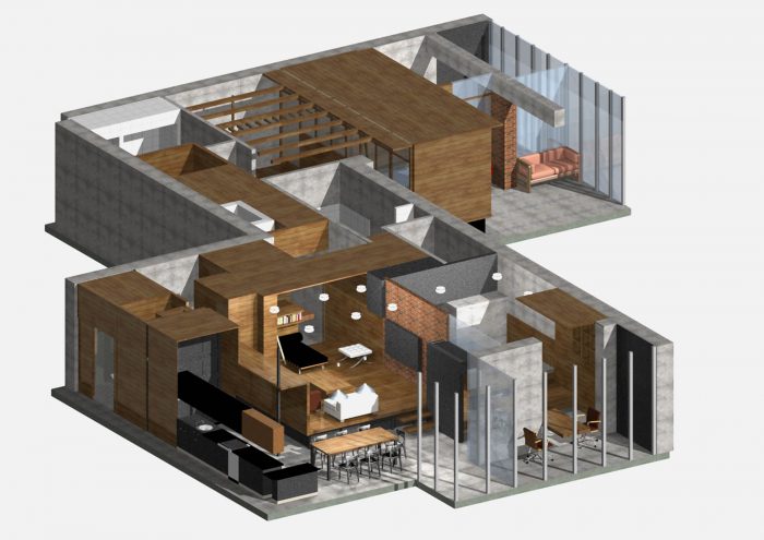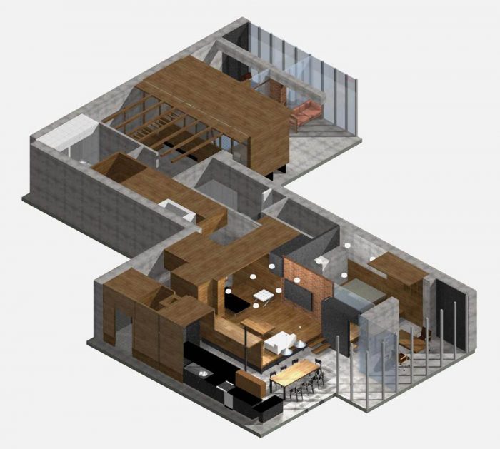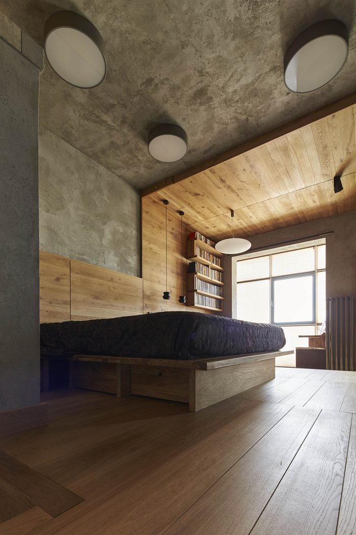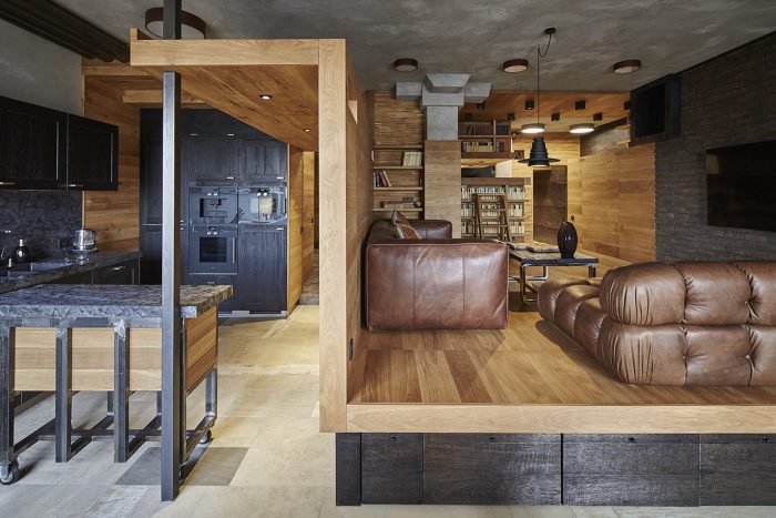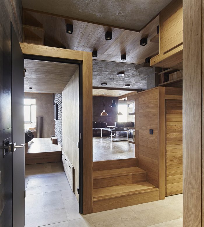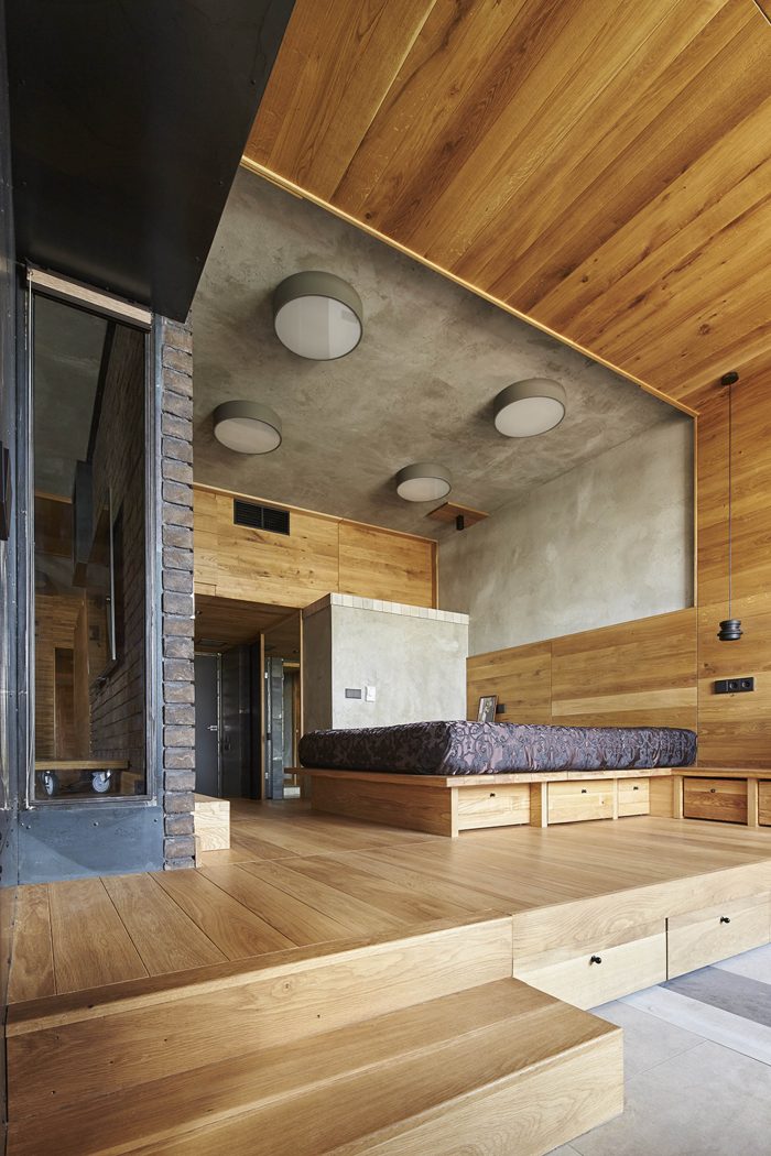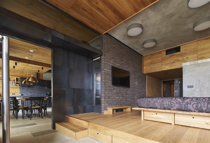 The front part of the apartment is designed as a free-flowing space, where each area maintains visual connection with the others. The master bedroom is also one of the zones of this space and is connected by wide gates/doors and window-like openings. The bed is raised on a podium and is hidden behind a brick wall, which makes it not visible from the living room from any angle. Thus, the living area receives a visual extension, but the sleeping area retains its intimacy. Protruding volume in the living room enhances the spatial relationship between the bedroom and the living room. It does not reach the ceiling and is trimmed with the sheets of black metal to emphasize the subtlety of this structure.