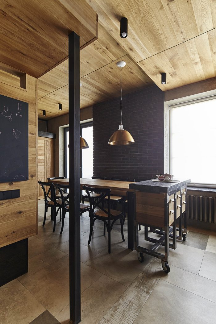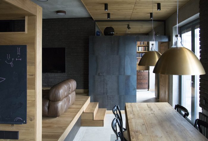 There are several different textures combined in the decor: dark brick, light oak planks, sheets of black metal, ceramic tile and rough plaster. Glass partitions are widely used in the interior. The playroom is decorated with tinted cork. All the materials are subject to specific hierarchy, and as such they create a harmonious ensemble.