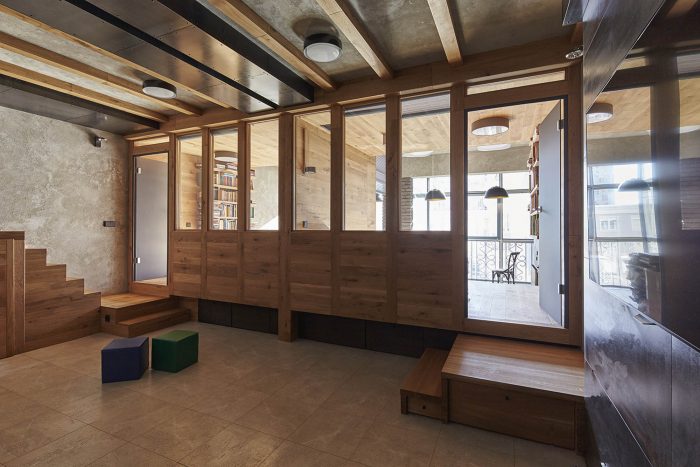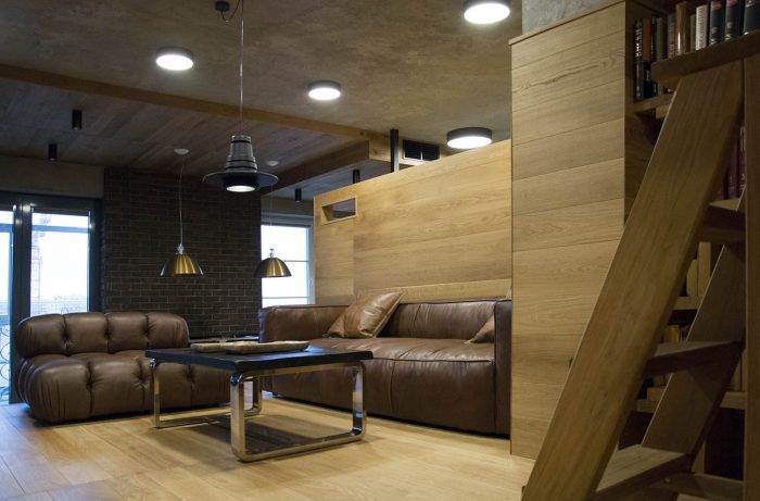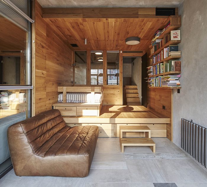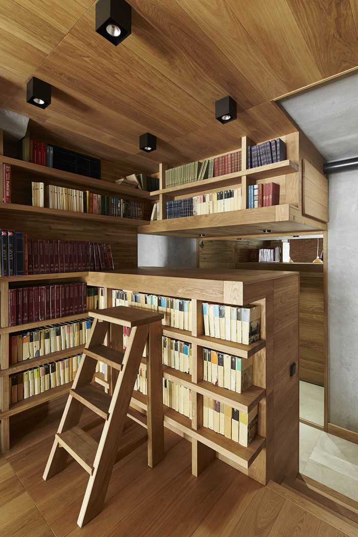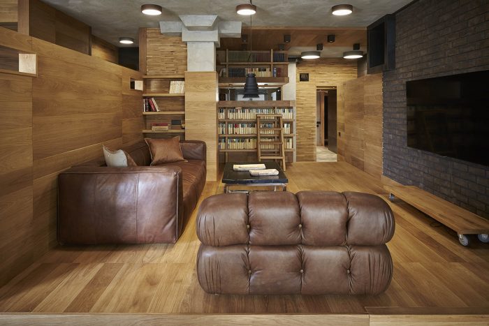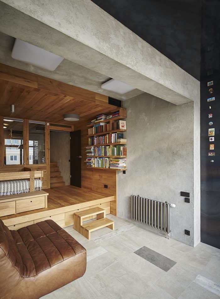 “Soft” (aka TV) living area is raised on a podium and pushed back from the front windows. So moderate lighting, special comfort and magnificent view from the windows lowered into the floor is created. Living area is separated from the corridor by bookshelves. These bookshelves are organized in the mutual composition with a high-lounger for reading. One can climb up to it using the removable ladder. There is a storage space under the lounger.