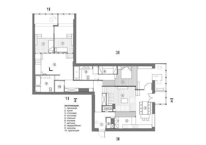 This apartment is designed for a family with two small children. It is divided into two unequal parts, where the first part is at the front of the apartment near the entrance. This part consists of a kitchen, a living room, a dining room and a master bedroom. The second part is a smaller area in the back of the apartment, which is dedicated for children. There are two children's rooms and a play area here. A lengthy corridor connects these two parts with utility rooms along the way: a dressing room/closet, a pantry, a laundry room and two bathrooms.