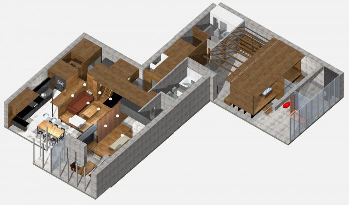 在装饰中结合了几种不同的质地:深色砖、浅色橡木板、黑色金属片、瓷砖和粗糙的石膏。玻璃隔断在室内被广泛使用。游戏室是用有色软木装饰的。所有的材料都受制于特定的等级制度,因此它们形成了一个和谐的组合。