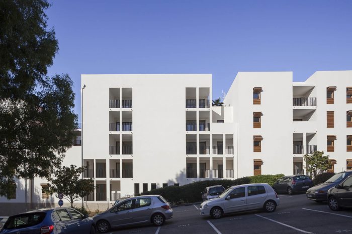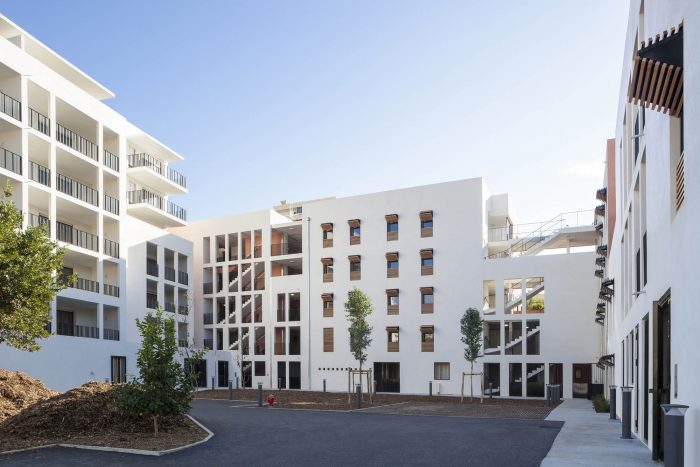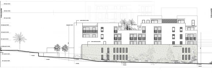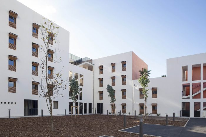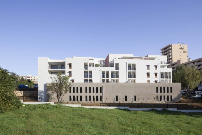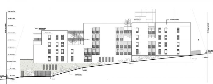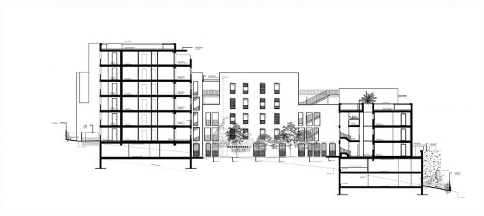 The challenge is to create a global project of social diversity in a strongly sloping terrain. The project moved into the slope with its base of textured concrete. This creates a large central patio that offers a comforting horizontal space.