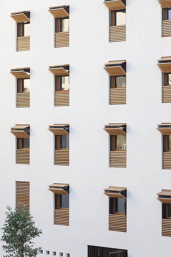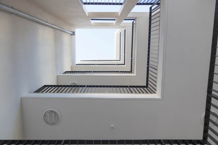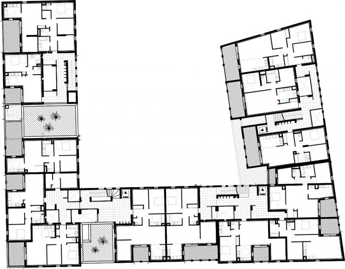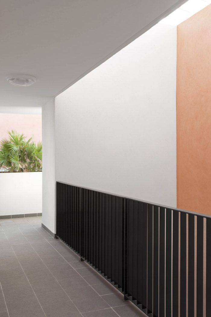 所有的住处都是通透的,它们被整合在框架体量中的外部走道所服务。室外走道被视为有益的生活空间,遮蔽了地窖,并允许人们见面。