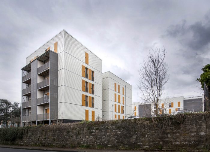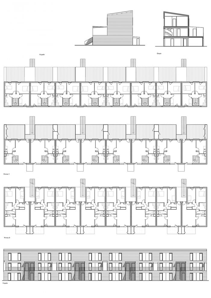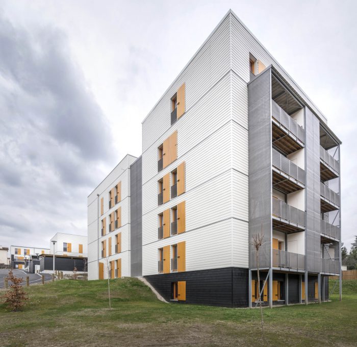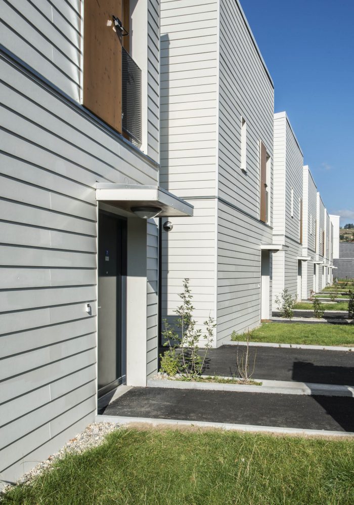 The entire programme, composed of individual grouped accommodation units, intermediate housing and small collective housing blocks, is entirely built using dry construction methods employing 2D macro-components along with 3D modules for the sanitary and technical facilities. This construction method developed by Ossabois is known as the "5D process".