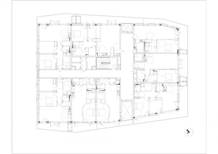 关于S楼,建筑的密度和分布的效率(每层8个住宅)意味着对每个空间,特别是公共区域的自然光输入的精确工作。为居民发明的路径始于一个南北向的双视角大厅,并配有一个西北方向的片段。在建筑中的这种切割允许在沐浴在光线中的共享空间中创造出清晰的北、南、西三面视野。