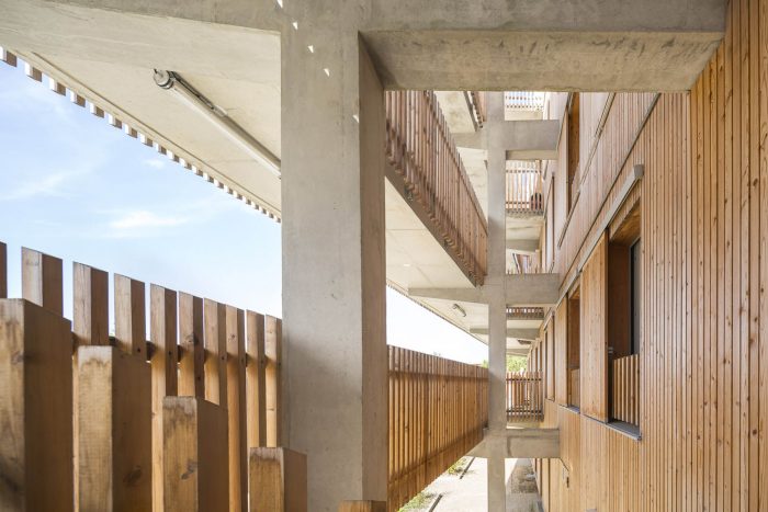 These «pontoons» establish a gradual distance between public and private spaces. In addition, displaced accesses to the entrances preserve the dwellings’ intimacy from the traffic. The outdoor corridors give access to the dwellings thanks to private footbridges.