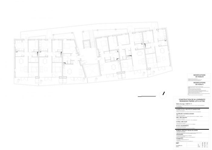 这个64套住宅的项目,分为两栋楼,在皮埃尔-洛蒂住宅的中心地带实施,完成了城市重建。总体规划将该项目置于不同建筑类型和密度的十字路口。因此,这个过程的目的是在环境中实现一个体积的过渡,为新的皮埃尔-洛蒂街的未来身份做出贡献。